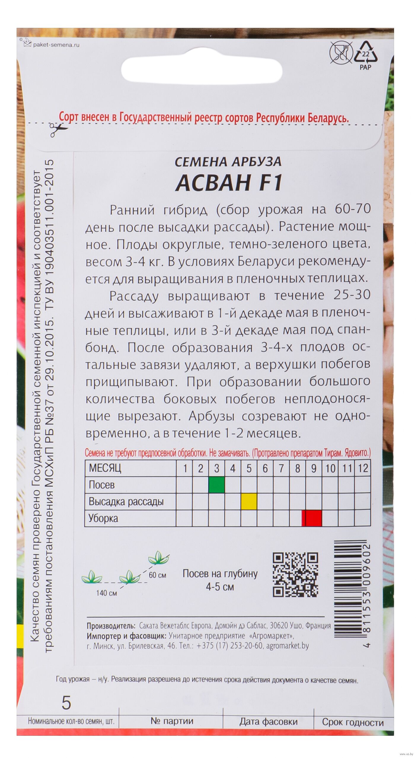 Посев 1-3 декада марта. Высадка рассады – 1-3 декада мая. Урожай – 3 декада августа – 3-я декада сентября. Глубина посева 4-5 см. Схема посадки 140х60 см. Семена не требуют предпосевной обработки.