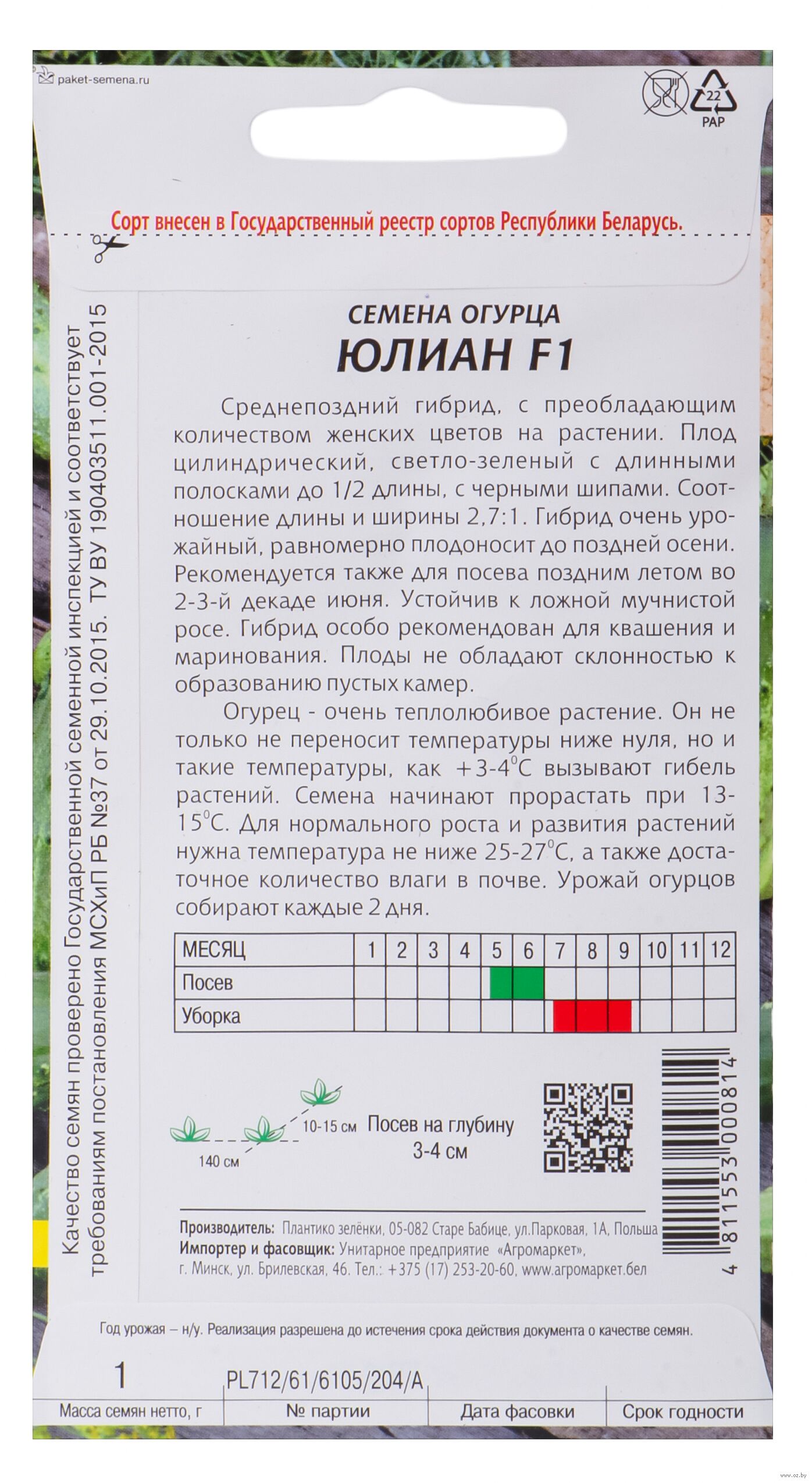 | Изготовитель | УП "Агромаркет", РБ, 220039, Беларусь, г. Минск, ул. Брилевская, 46 |
