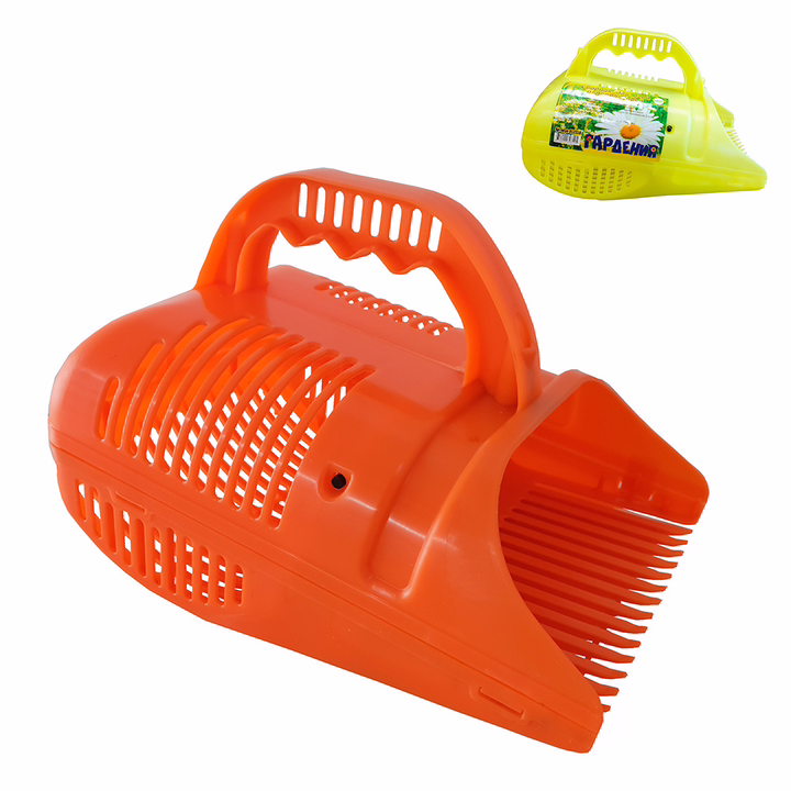 Удобная ручка позволяет легко и быстро собирать ягоды, а заслонка препятствует попаданию крупного мусора и выпадению ягод из него.