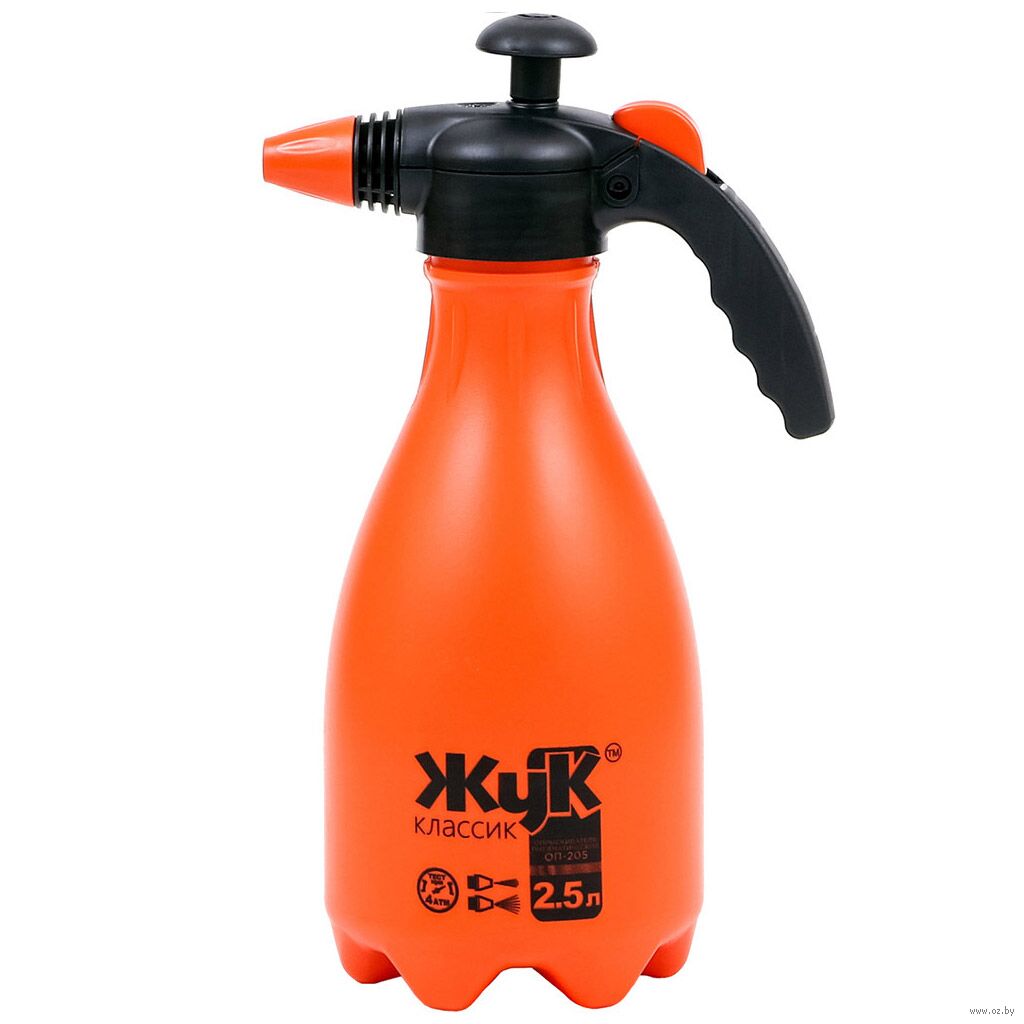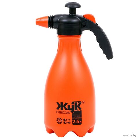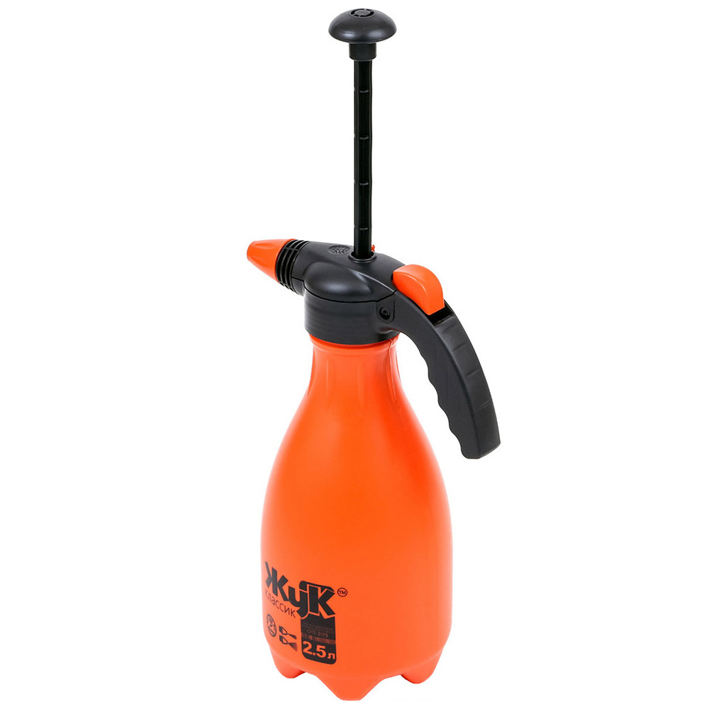 Опрыскиватель-распылитель садовый пластмассовый 2,5 л "Жук Классик", выдувной бак с распылительным узлом с насосом и распылителем, регулировка распыла: от струи до тумана, предохранительный клапан, мерная шкала.