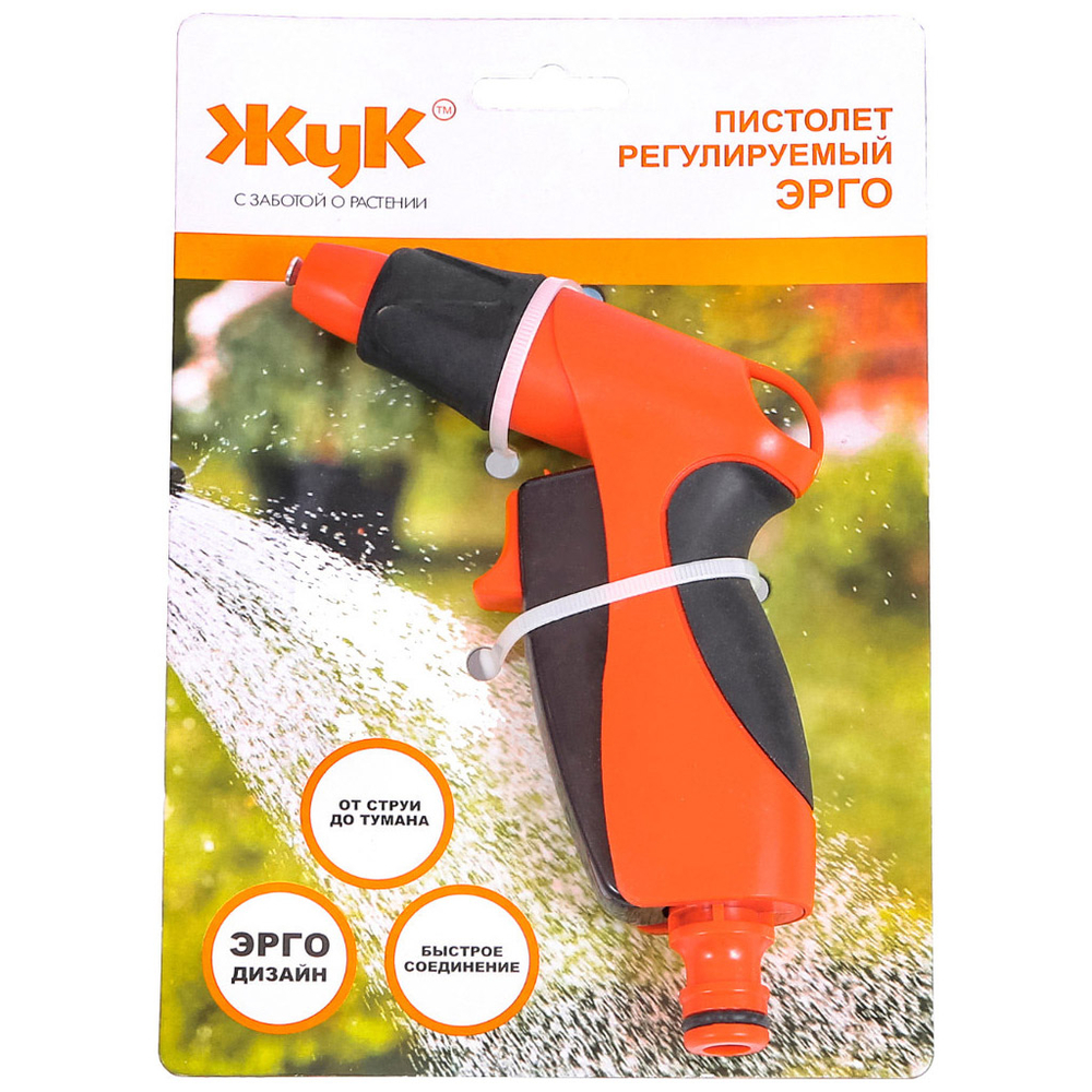 Пистолет поливочный с универсальным штуцером для подключения шланга диаметром 1/2 и 3/4 "Жук Эрго", регулируемый, пластик.
