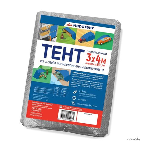 Тент из полипропилена 60г/м2, водонепроницаемый, на люверсах, серый.