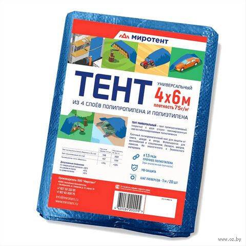 Тент из полипропилена 75г/м2, водонепроницаемый, на люверсах, синий.