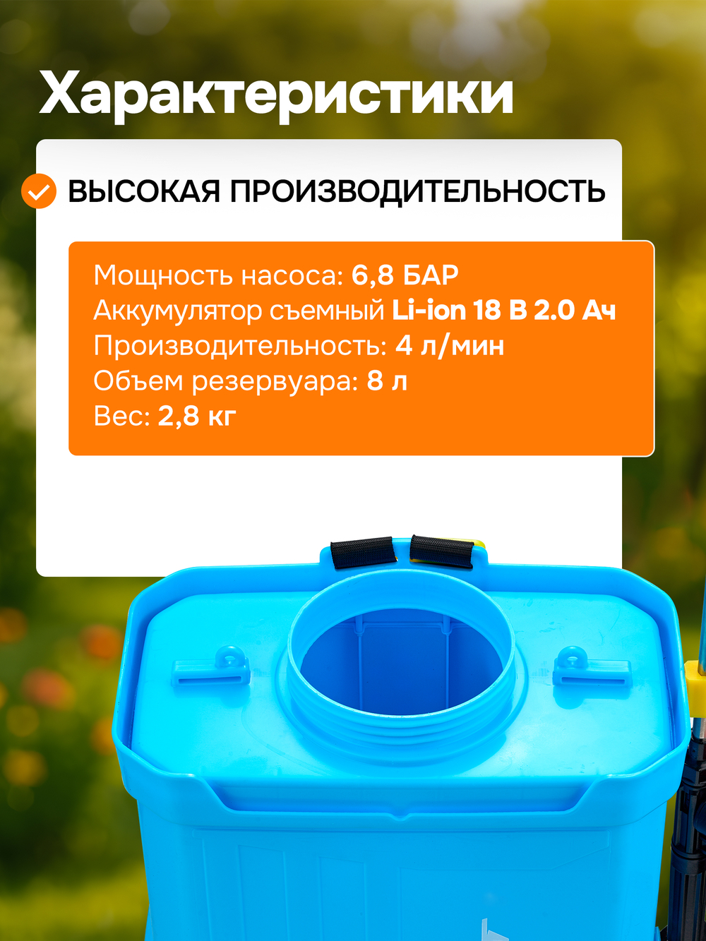 DF-B8li – это компактный и удобный аккумуляторный опрыскиватель с высоким рабочим давлением до 6.8 бар и производительностью 4 л/мин, идеально подходящий для обработки растений, опрыскивания удобрениями и защиты садовых культур.
