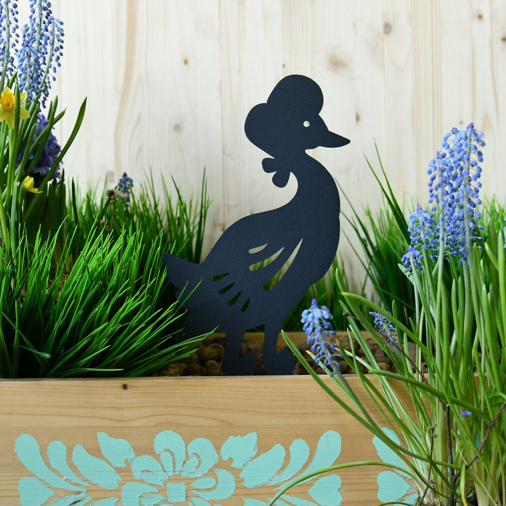 Предназначена для украшения сада, огорода, газона, клумбы или приусадебного участка. Благодаря заостренному колышку, фигурка легко втыкается в землю, а специальное отверстие в нем, дает возможность установки фигурки на стене или заборе.