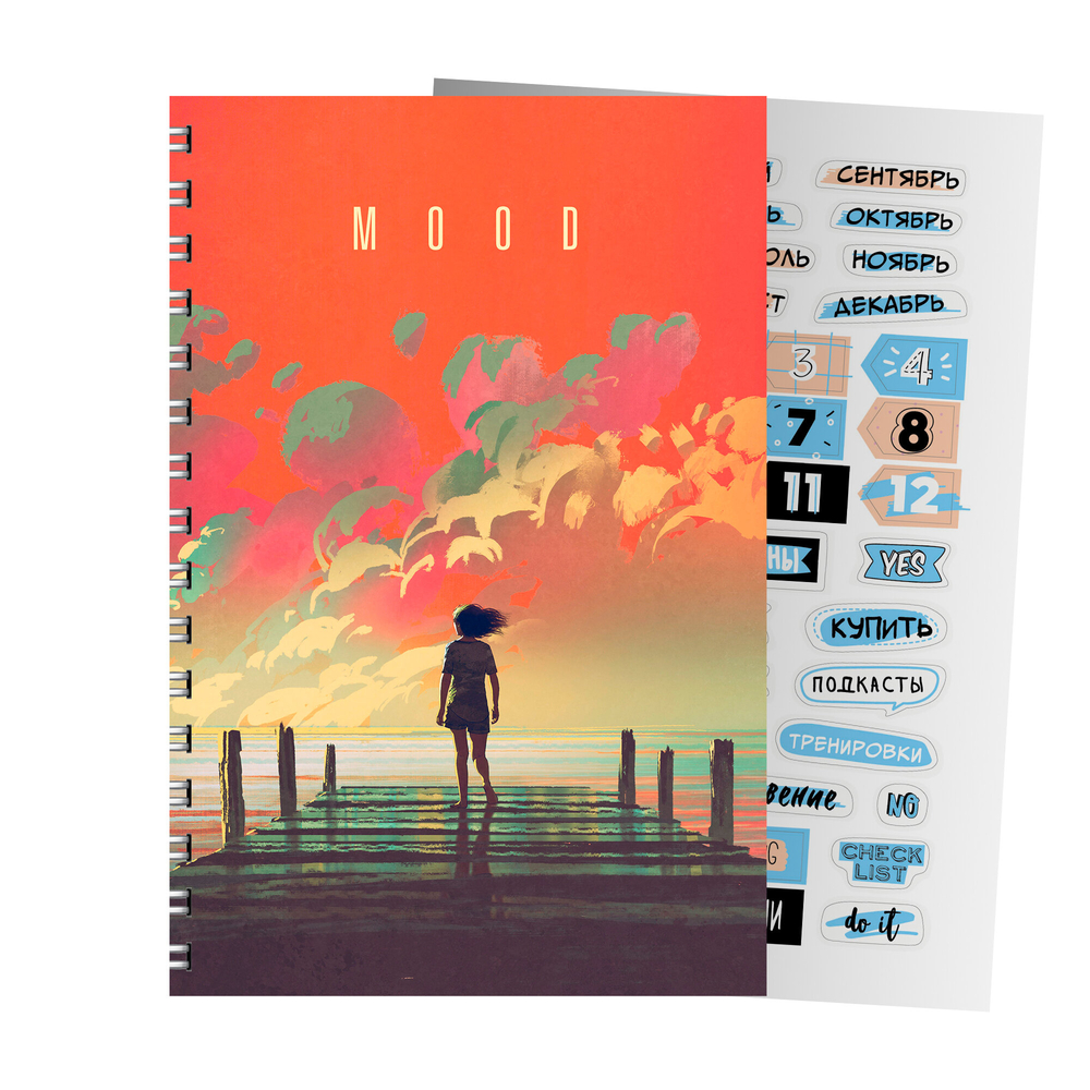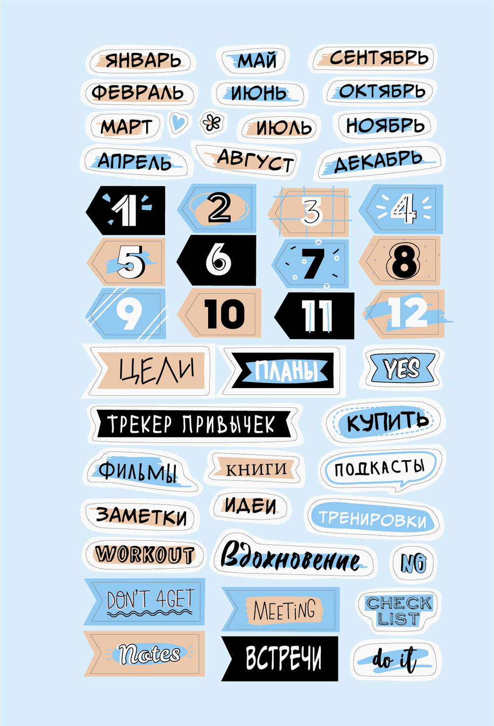 Яркие дизайны с забавными персонажами и надписями зарядят на позитив и продуктивность, а лист с наклейками для ведения списков целей и задач поможет идеально все спланировать.