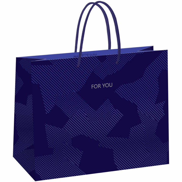 Пакеты MESHU – беспроигрышный способ преподнести подарок красиво. Изготовлен из плотного мелованного картона с матовой ламинацией. Дизайн пакета вдохновлен глубокими и насыщенными оттенками синего цвета, что придает ему особую элегантность и утонченность. На лицевой стороне пакета изображен яркий и стильный узор в синих тонах. Цветовая гамма включает в себя глубокие оттенки синего, которые ассоциируются с спокойствием, уверенностью и гармонией. Узор выполнен в виде геометрических фигур.
