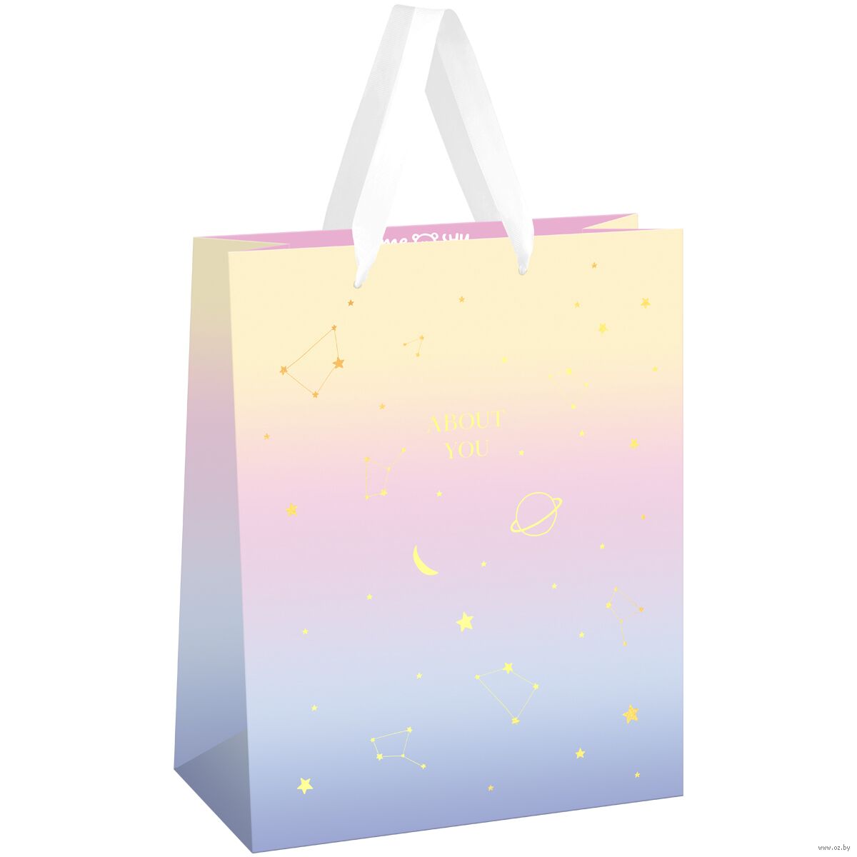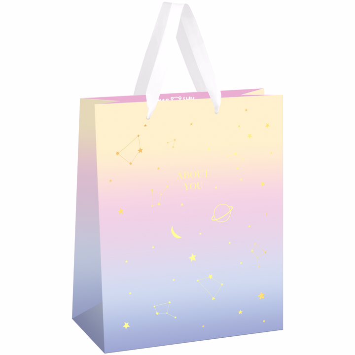 Изготовлен из плотного мелованного картона с матовой ламинацией. Дизайн пакета вдохновлен бескрайним космосом, что придает ему особую атмосферу. На лицевой стороне пакета изображен красивый рисунок, изображающий ночное небо с луной и звездами.Цветовая гамма включает в себя нежные оттенки синего и золотого, которые создают ощущение спокойствия и умиротворения.