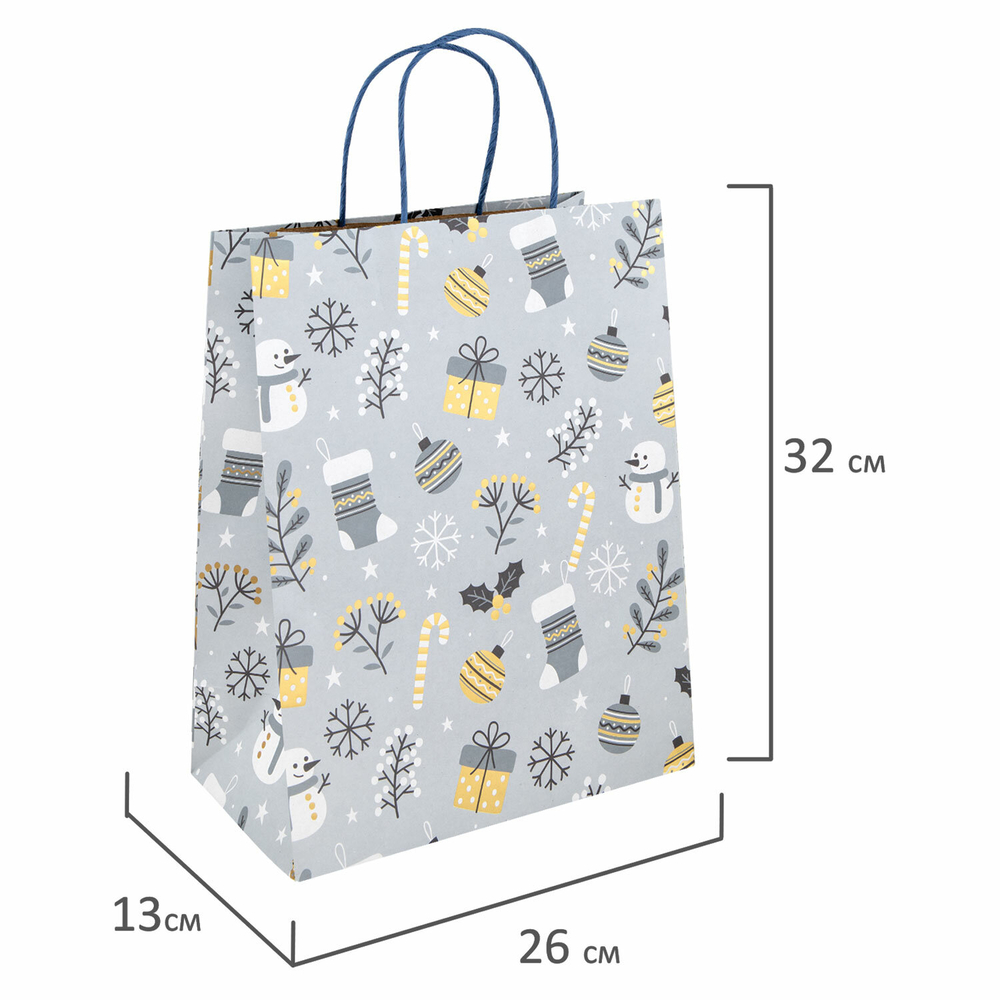 Подарочный пакет новогодний изготовлен из крафт-бумаги, имеет бумажные ручки. Пакет выполнен с изображением новогодних атрибутов. С лицевой стороны пакета некоторые детали покрыты тиснением золотистой фольгой.