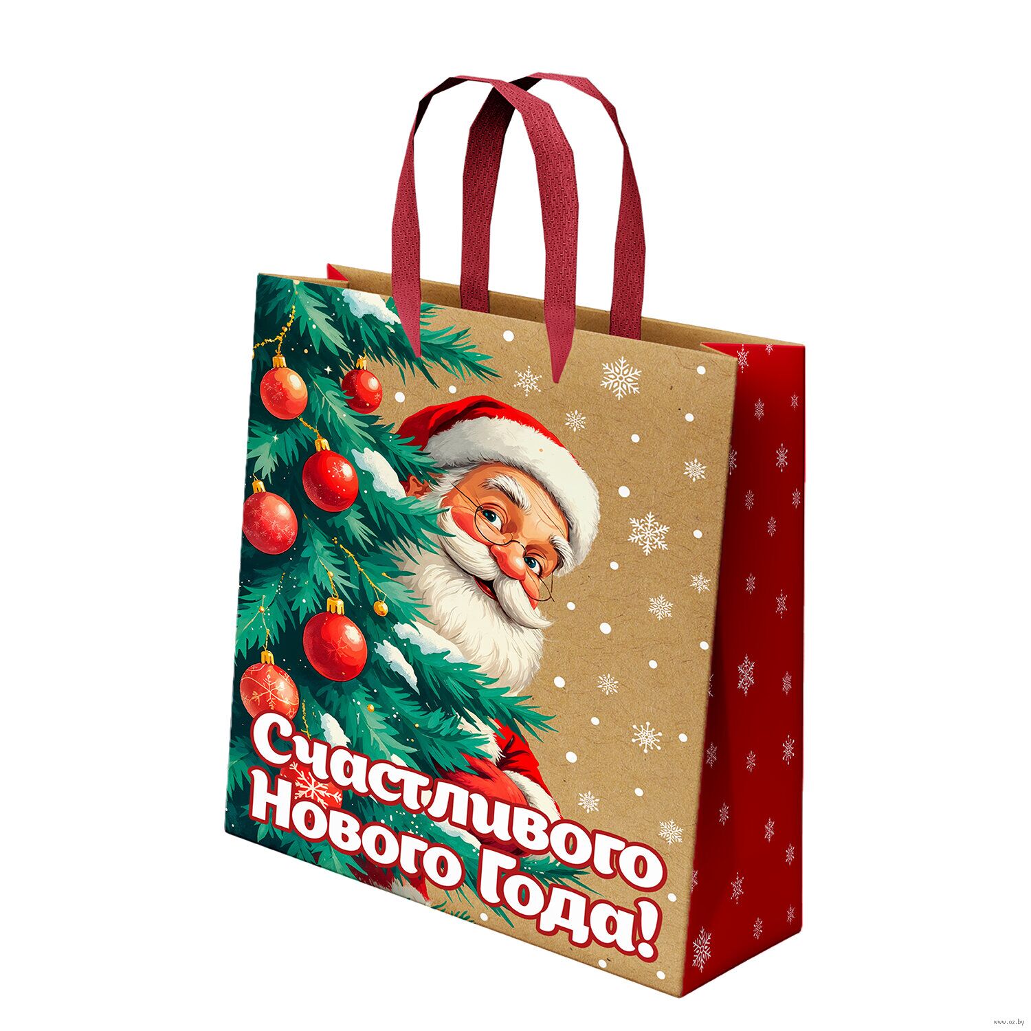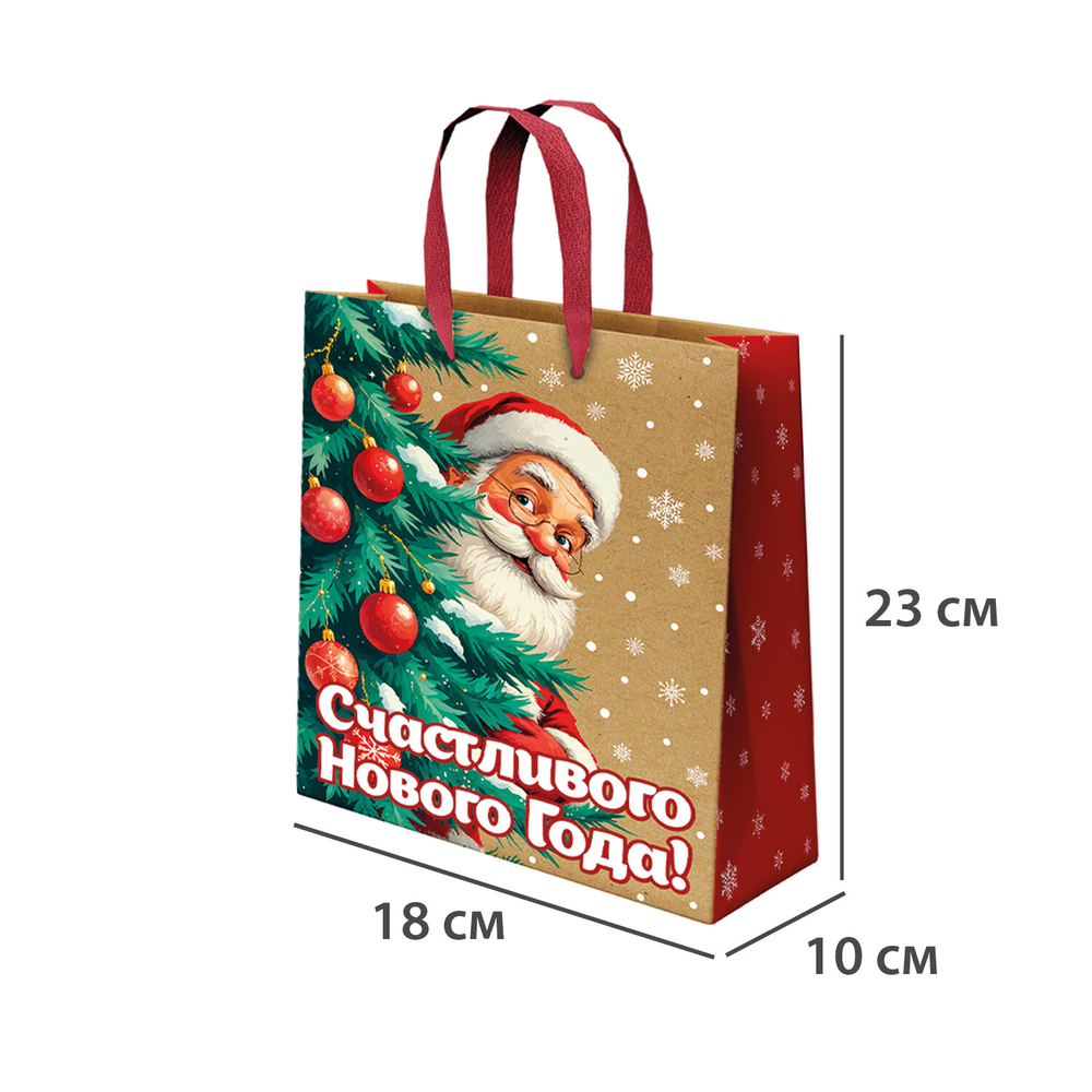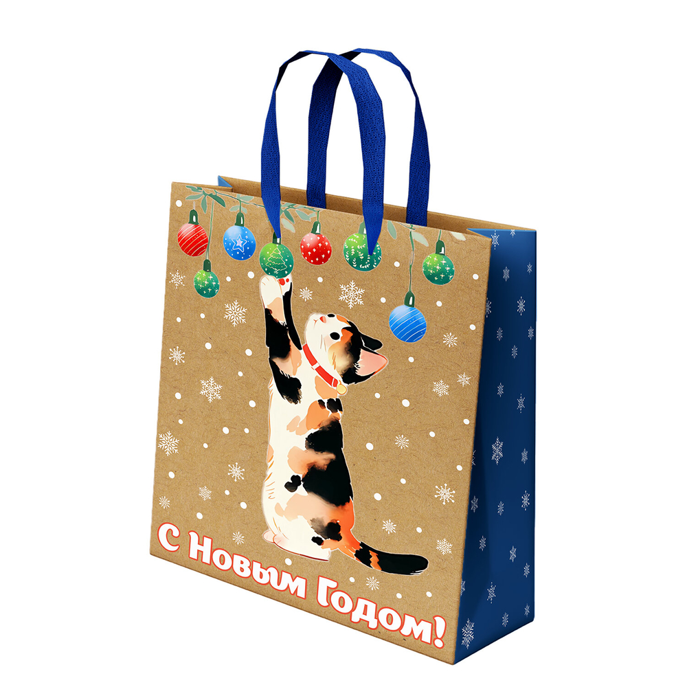 Подарочный новогодний пакет изготовлен из крафт-бумаги, снабжен ленточными ручками из полиэстера.