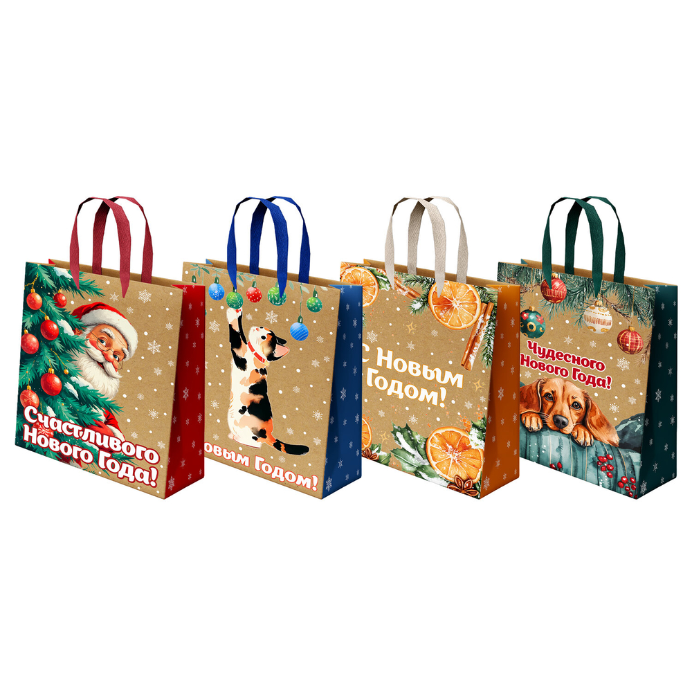 На пакетах изображены иллюстрации в новогодней тематике и поздравительные надписи (ассорти без возможности выбора), которые точно вызовут улыбку.