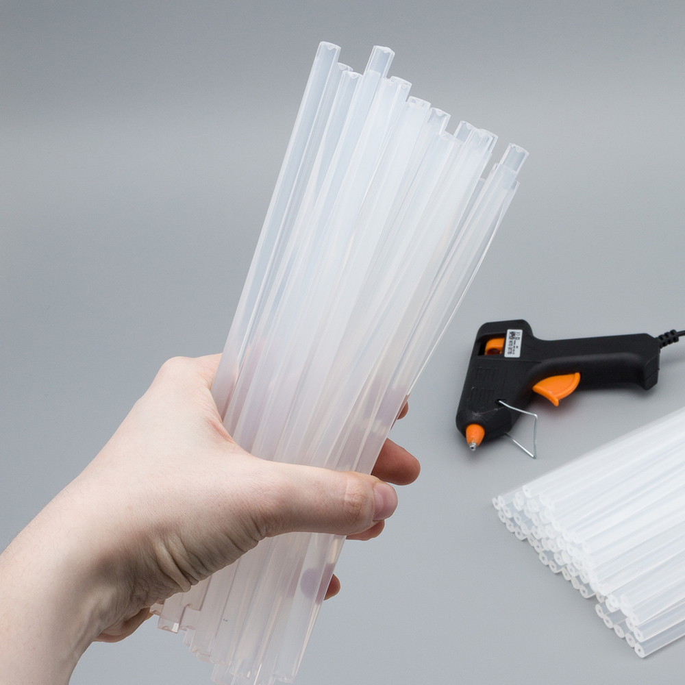 Стержни для клеевого пистолета изготовлены из термоплавкого полимера. Универсальны, подходят для текстиля, пластика, дерева, фарфора и других материалов. Клеевой пистолет используется для реализации самых разнообразных проектов: от создания аппликаций и подгибки изделий до украшения букетов и флористических композиций.