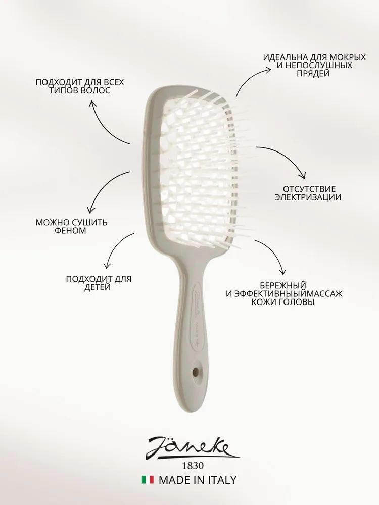 Superbrush – это уникальная массажная щетка с запатентованной технологией, которая подойдет для ухода за волосами всех типов и детскими локонами. Запатентованная перфорация на зубчиках не вырывает волосы, а бережно расчесывает их по всей длине, что уменьшает травматичность волос и сохраняет их густоту, подходит для мокрых волос. Специально закругленные на краях зубчики расчески предупреждают травмирование эпидермиса.