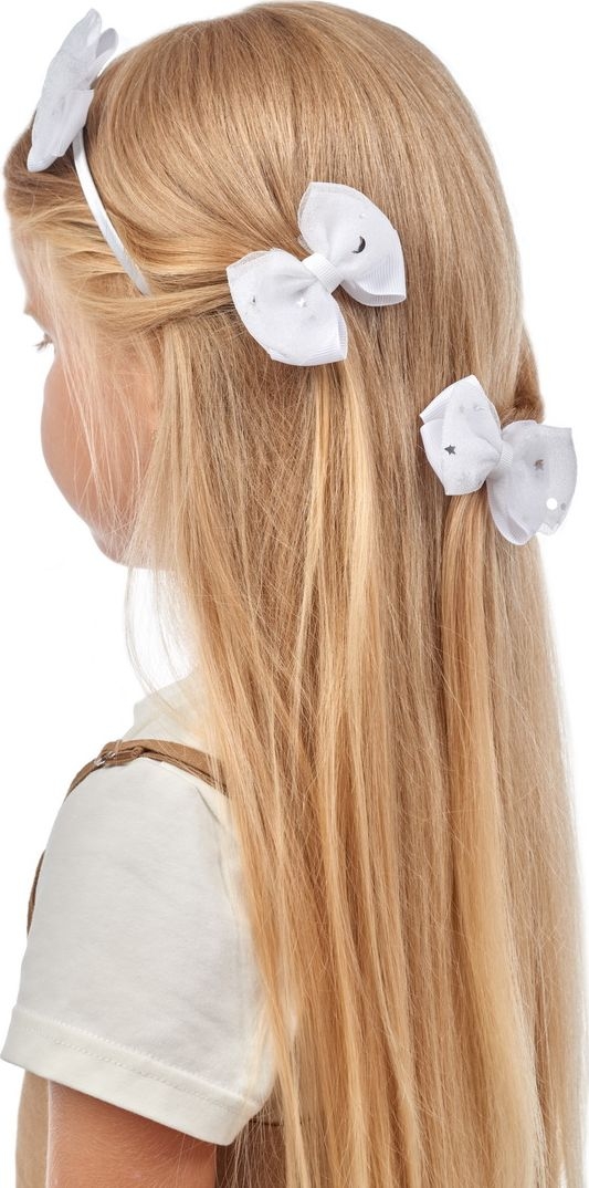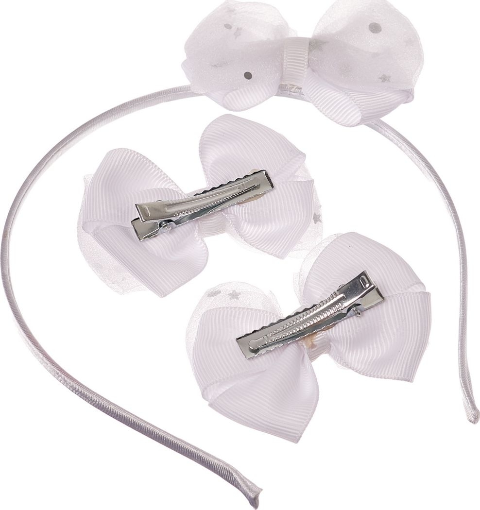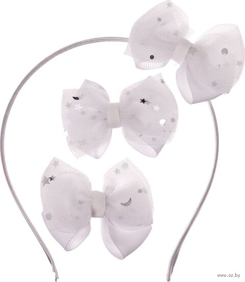 Набор заколок, одновременно, нарядный и повседневный аксессуар настоящей леди! Набор включает ободок и две заколки с зажимом, обрамленных воздушными бантиками с сияющими звездочками. Заколки с зажимом отлично держатся даже на тонких волосах, поэтому не доставят дискомфорта своей обладательнице.
