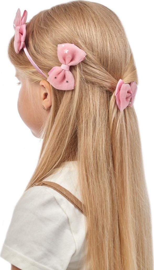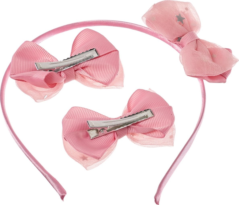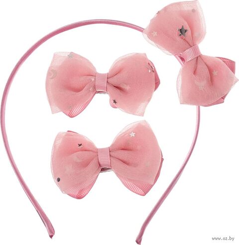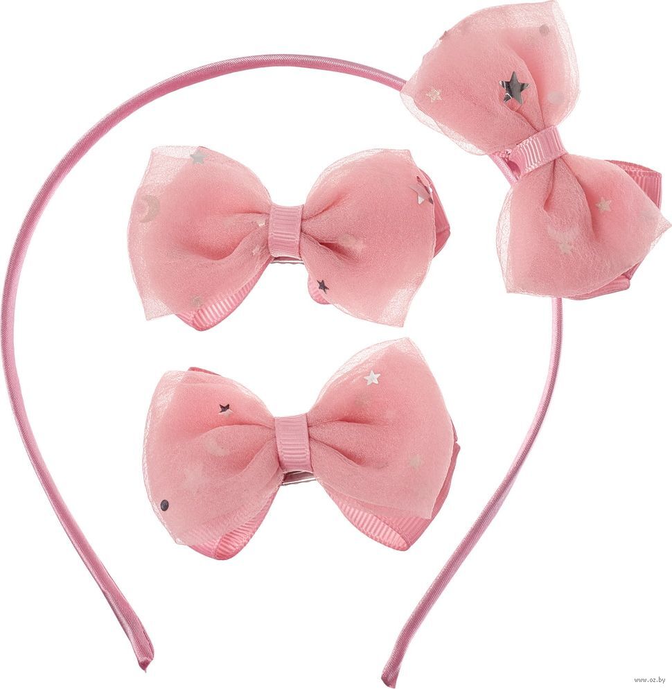 Ободок и заколки с бантиком из фатина, украшенный мерцающими звездочками, подарят маленькой принцессе праздничное настроение и дополнят образ.