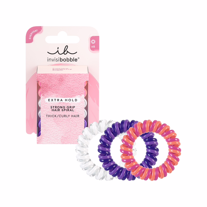 Набор Invisibobble Extra Hold Twirl Boss – это 6 резиночек для фиксации густых или кудрявых волос в фиолетовом, белом и розовом оттенках.