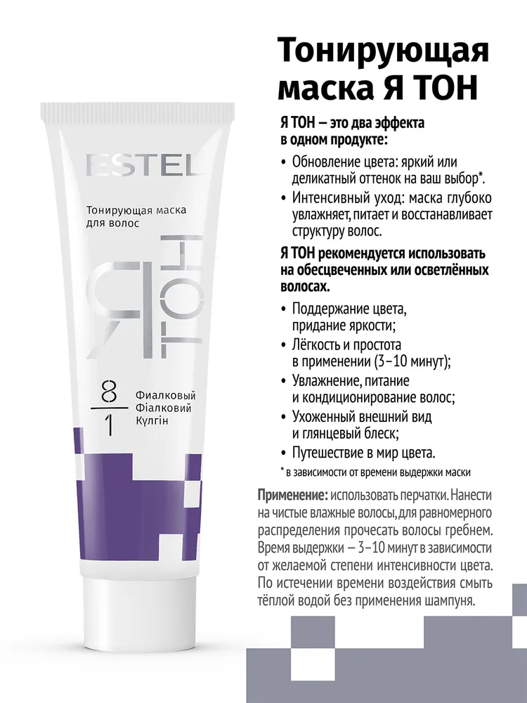 Тонирование и интенсивный уход за волосами.Тонирующая маска "ЯТон" придает волосам желаемый оттенок, увлажняет, кондиционирует, усиливает блеск волос. Создана для окрашенных и натуральных волос.