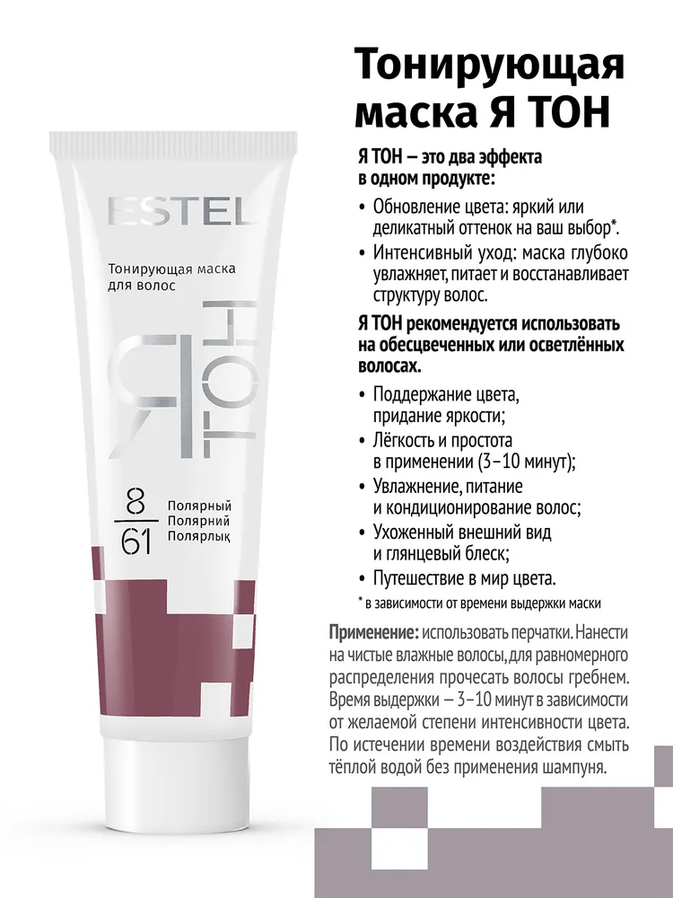 Тонирование и интенсивный уход за волосами.Тонирующая маска "ЯТон" придает волосам желаемый оттенок, увлажняет, кондиционирует, усиливает блеск волос. Создана для окрашенных и натуральных волос.