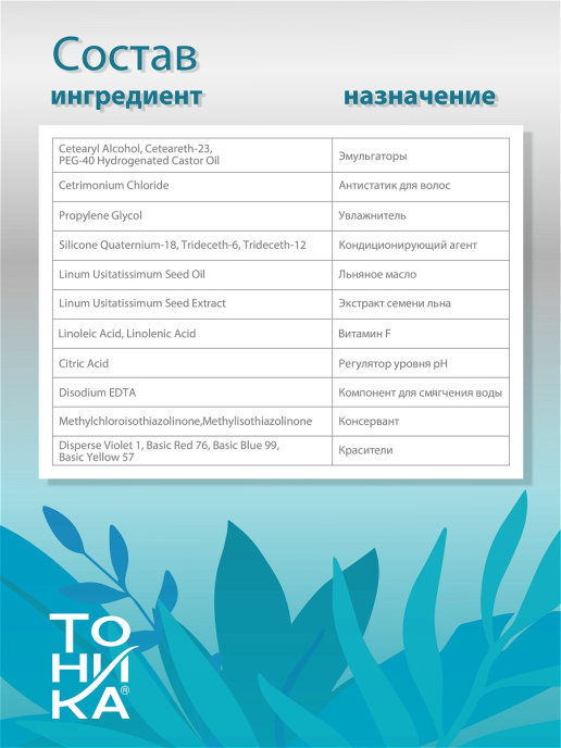 Aqua, Cetearyl Alcohol, Propylene Glycol, Ceteareth-23, PEG-40 Hydrogenated Castor Oil, Cetrimonium Chloride, Linum Usitatissimum Seed Oil, Silicone Quaternium-18, Trideceth-6, Trideceth-12, Linum Usitatissimum Seed Extract, Linoleic Acid, Linolenic Acid, Disodium EDTA, Citric Acid, Parfum, Methylchloroisothiazolinone, Methylisothiazolinone, Disperse Violet 1, Basic Red 76, Basic Blue 99, Basic Yellow 57.