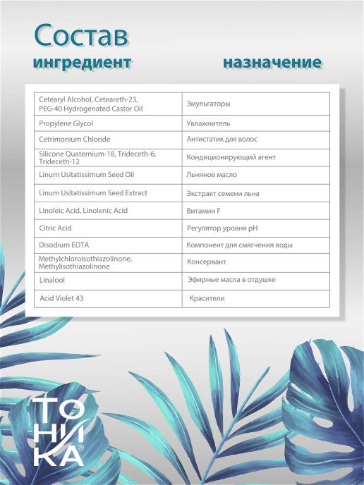 Aqua, Cetearyl Alcohol, Propylene Glycol, Ceteareth-23, PEG-40 Hydrogenated Castor Oil, Cetrimonium Chloride, Linum Usitatissimum Seed Oil, Silicone Quaternium-18, Trideceth-6, Trideceth-12, Linum Usitatissimum Seed Extract, Linoleic Acid, Linolenic Acid, Disodium EDTA, Citric Acid, Parfum, Methylchloroisothiazolinone, Methylisothiazolinone, Linalool, Acid Violet 43.