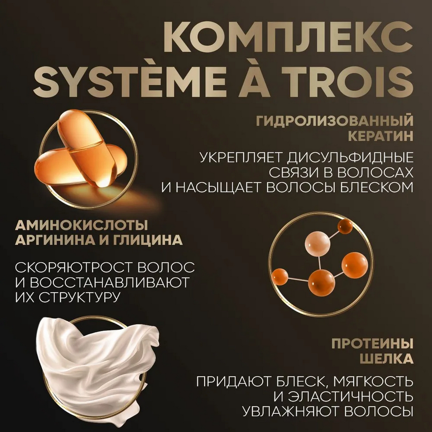 Инновационный ухаживающий комплекс Système à trois содержит минокислоты аргинина и глицина, гидролизованный кератин и протеины шелка. Аминокислоты укрепляют кровоснабжение волосяных фолликулов (луковиц), ускоряют рост волос и восстанавливают их структуру. Гидролизованный кератин укрепляет дисульфидные связи в волосах, связываясь с аминокислотами, делает волосы более устойчивыми к ломкости и более крепкими к внешним воздействиям. Протеины шелка интесивно увлажняют, снимают статику, придают волосам мягкость и эластичность, делая их гладкими, блестящими и послушными.
