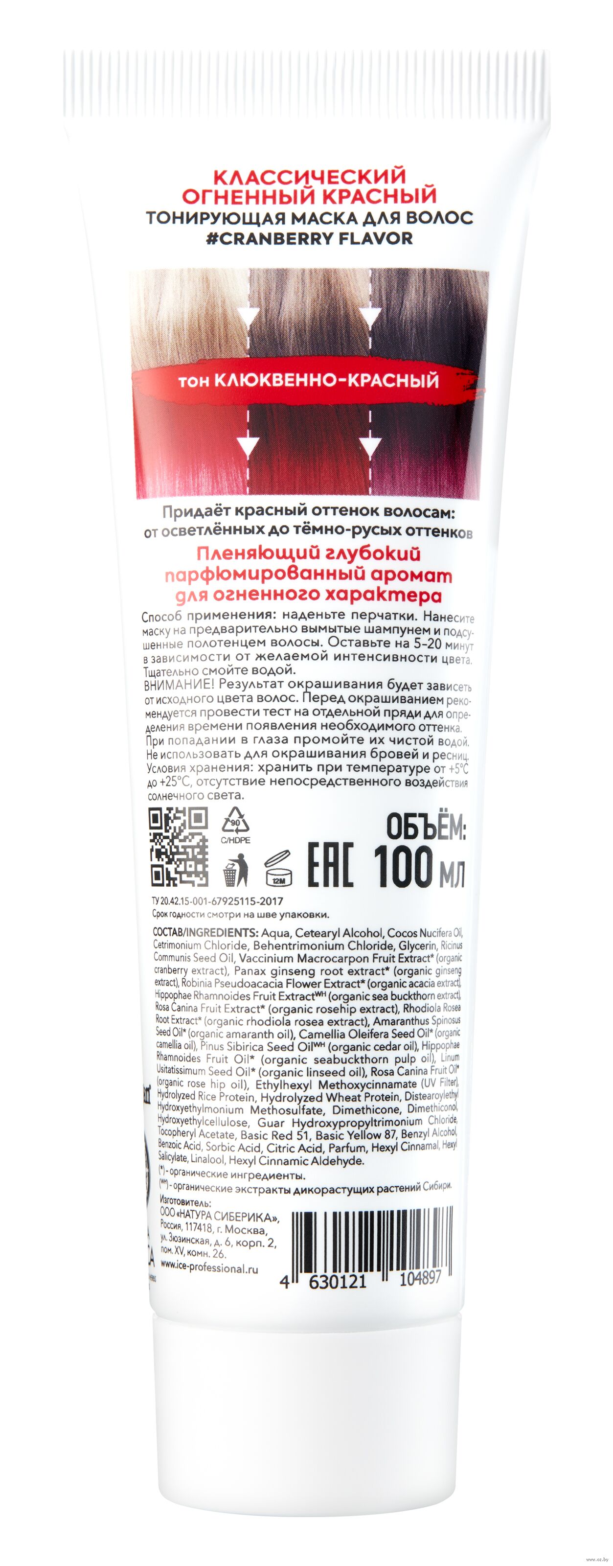 Тонирующая маска для волос Cranberry. Тон – клюквенно-красный. Придаёт красный оттенок волосам: от осветлённых до тёмно-русых оттенков. Пленяющий глубокий парфюмированный аромат для огненного характера.