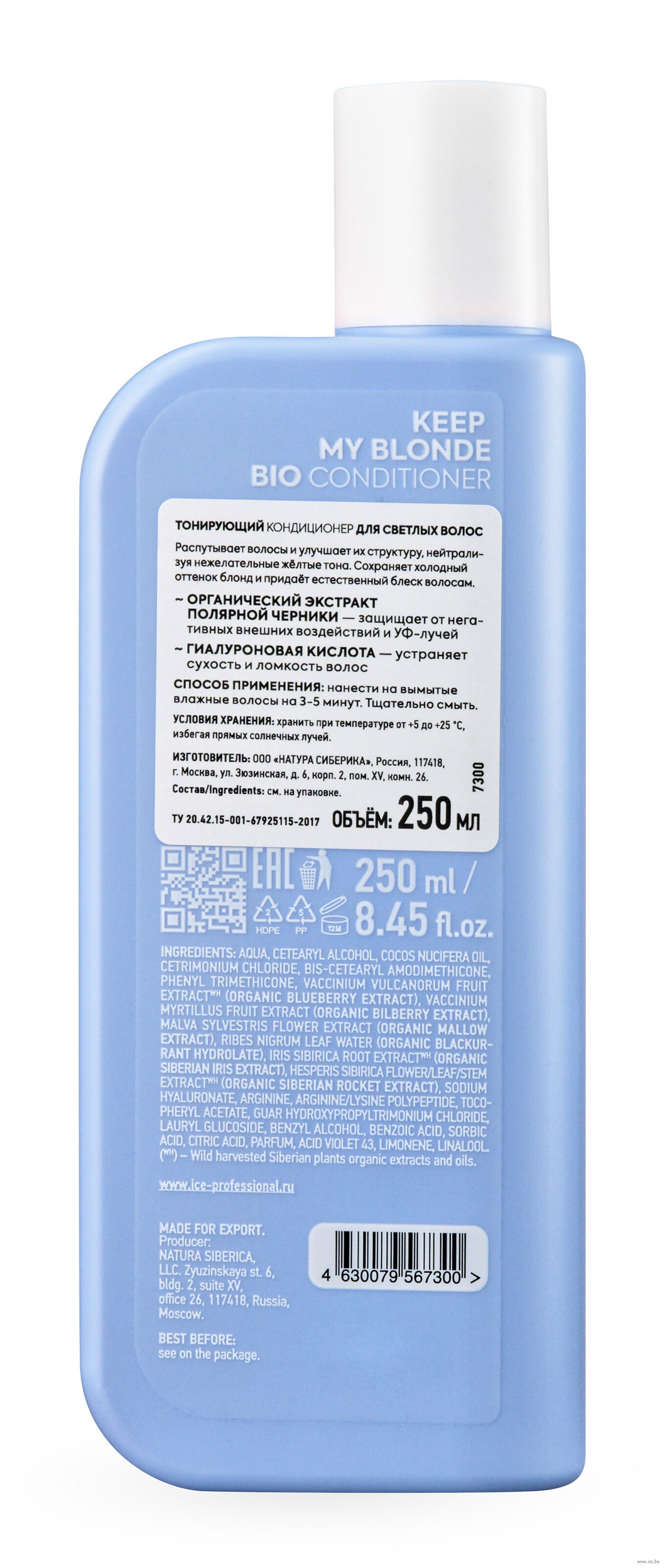 Аqua, cetearyl alcohol, cocos nucifera oil, cetrimonium chloride, bis-cetearyl amodimethicone, phenyl trimethicone, vaccinium vulcanorum fruit extract wh (organic blueberry extract), vaccinium myrtillus fruit extract (organic bilberry extract), malva sylvestris flower extract (organic mallow extract), ribes nigrum leaf water (organic blackurrant hydrolate), iris sibirica root extract wh (organic sibirian iris extract), hesperis sibirica flower/leaf/stem extract wh (organic sibirian rocket extract), sodium hyaluronate, arginine, arginine/lysine polypeptide, tocopheryl acetate, guar hydroxypropyltrimonium chloride, lauryl glucoside, benzyl alcohol, benzoic acid, sorbic acid, citric acid, parfum, acid violet 43, limonene, linalool. (wh) - wild harvested siberian plants organic extracts.Мы используем файлы cookie для обеспечения удобства работы с сайтом и его контакта с пользователем.