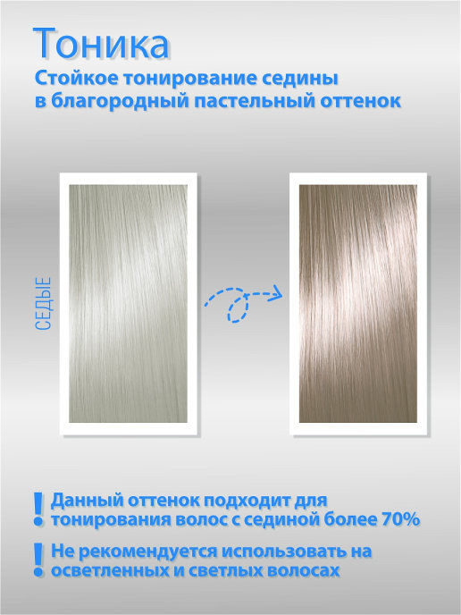 Время выдержки необходимо подобрать индивидуально, так как оттенок зависит от структуры седины. Не рекомендуется для осветленных волос.