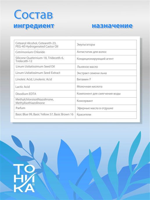 Aqua, Cetearyl Alcohol, Cetrimonium Chloride, Ceteareth-23, PEG-40 Hydrogenated Castor Oil, Linum Usitatissimum Seed Oil, Silicone Quaternium-18, Trideceth-6, Trideceth-12, Parfum, Linum Usitatissimum Seed Extract, Linoleic Acid, Linolenic Acid, Disodium EDTA, Lactic Acid, Methylchloroisothiazolinone, Methylisothiazolinone, Basic Blue 99, Basic Yellow 57, Basic Brown 16.