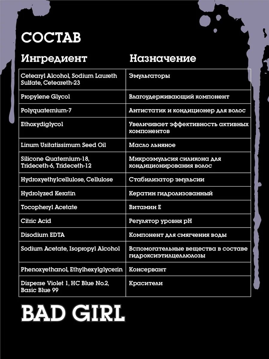 Cetearyl Alcohol, Sodium Laureth Sulfate, Ceteareth-23, Propylene Glycol, Polyquaternium-7, Ethoxydiglycol, Linum Usitatissimum Seed Oil, Silicone Quaternium-18, Trideceth-6, Trideceth-12 Hydroxyethylсellulose, Cellulose, Hydrolyzed Keratin, Tocopheryl Acetate, Citric Acid, Disodium EDTA, Sodium Acetate, Isopropyl Alcohol, Phenoxyethanol, Ethylhexylglycerin, Disperse Violet 1, HC Blue Nо.2, Basic Blue 99.Мы используем файлы cookie для обеспечения удобства работы с сайтом и его контакта с пользователем.