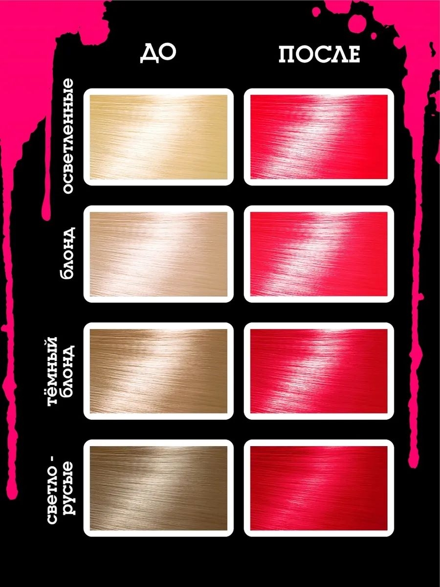 "Bad Girl" можно использовать на всех оттенках блонда, а также светло-русых волосах. Чем светлее волосы, тем насыщеннее и ярче будет результат. А максимально яркое окрашивание получится на осветленных волосах.