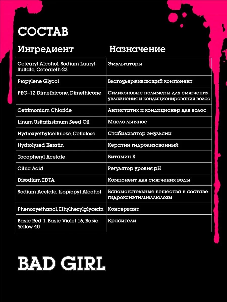Cetearyl Alcohol, Sodium Lauryl Sulfate, Ceteareth-23, Propylene Glycol, PEG–12 Dimethicone, Dimethicone, Cetrimonium Chloride, Linum Usitatissimum Seed Oil, Hydroxyethylсellulose, Cellulose, Hydrolyzed Keratin, Tocopheryl Acetate, Citric Acid, Disodium EDTA, Sodium Acetate, Isopropyl Alcohol Phenoxyethanol, Ethylhexylglycerin Basic Red 1, Basic Violet 16, Basic Yellow 40.Мы используем файлы cookie для обеспечения удобства работы с сайтом и его контакта с пользователем.