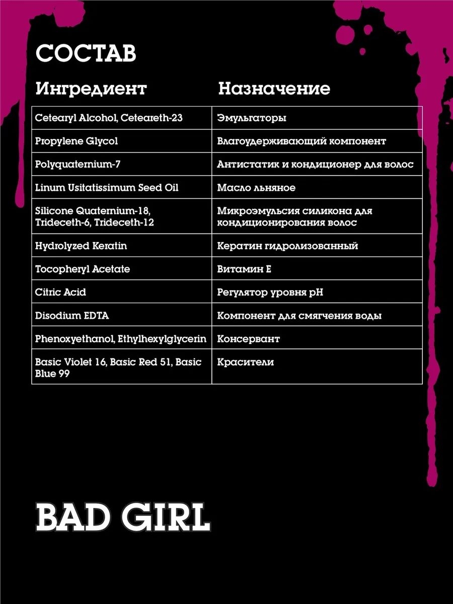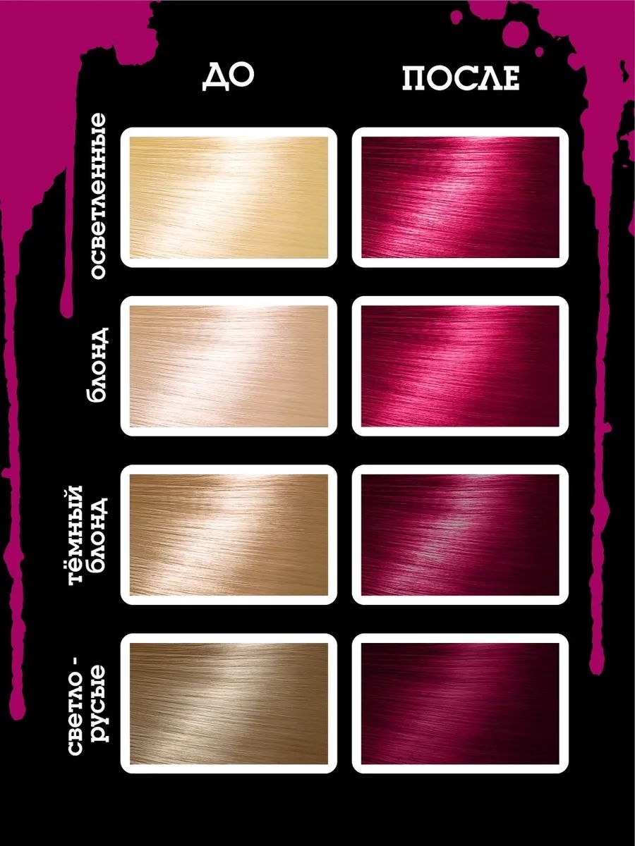 "Bad Girl" можно использовать на всех оттенках блонда, а также светло-русых волосах. Чем светлее волосы, тем насыщеннее и ярче будет результат. А максимально яркое окрашивание получится на осветленных волосах.