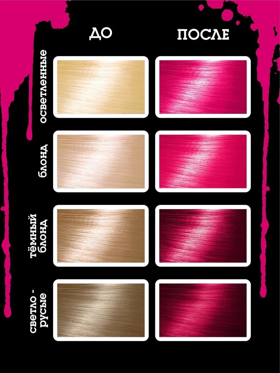 "Bad Girl" можно использовать на всех оттенках блонда, а также светло-русых волосах. Чем светлее волосы, тем насыщеннее и ярче будет результат. А максимально яркое окрашивание получится на осветленных волосах.