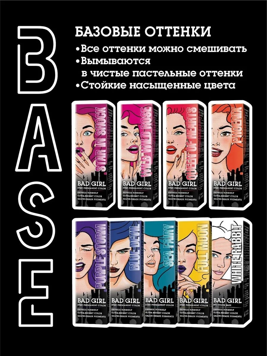 "Bad Girl" – коллекция пигментов прямого действия, обеспечивающих стойкое цветное окрашивание. Можно смешивать оттенки между собой, а также корректировать их интенсивность, от экстра ярких до сдержанных пастельных. Цвет держится до 100 дней, но при этом легко удаляется с волос, если нужно сменить образ. Идеальная консистенция обеспечивает ровный цвет по всей длине волос. Удобный аппликатор позволяет максимально точно наносить краситель. Теперь можно создавать самые смелые цветовые переходы.