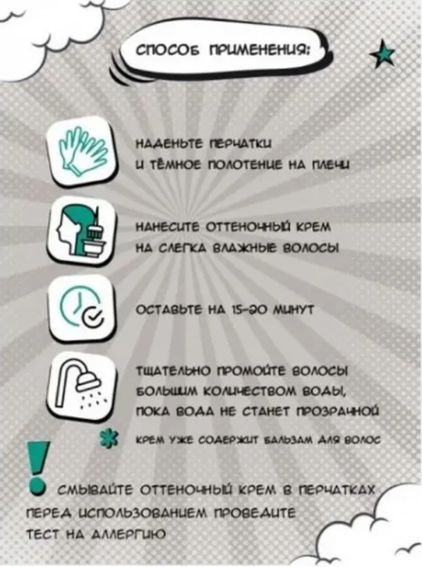 Перед началом окрашивания наденьте перчатки и набросьте на плечи темное полотенце для защиты одежды. Смывать оттеночный крем рекомендуется также в перчатках! Нанесите оттеночный крем на слегка влажные волосы. Оставьте для воздействия на 15-20 минут. По окончании времени воздействия тщательно промойте волосы большим количеством воды без шампуня и бальзама, пока вода не станет прозрачной. Оттеночный крем уже содержит кондиционирующий компонент.Состав