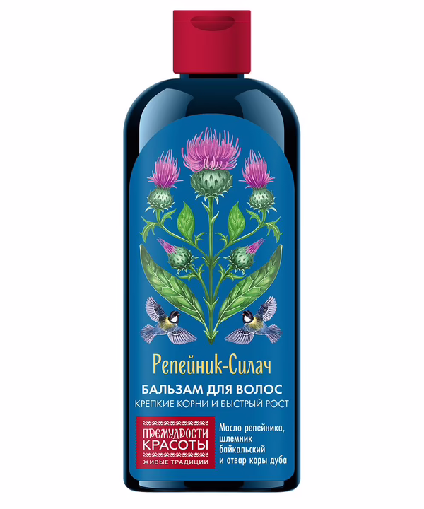 Бальзам для волос "Репейник-силач" сварен по старинному рецепту для сильных и здоровых волос. Репейное масло – кладезь витаминов, флавоноидов и дубильных веществ, которые укрепляют корни и предотвращают выпадение. Шлемник байкальский укрепляет волосяные луковицы и восстанавливает структуру волоса. Отвар коры дуба тонизирует кожу головы и ускоряет рост волос.
