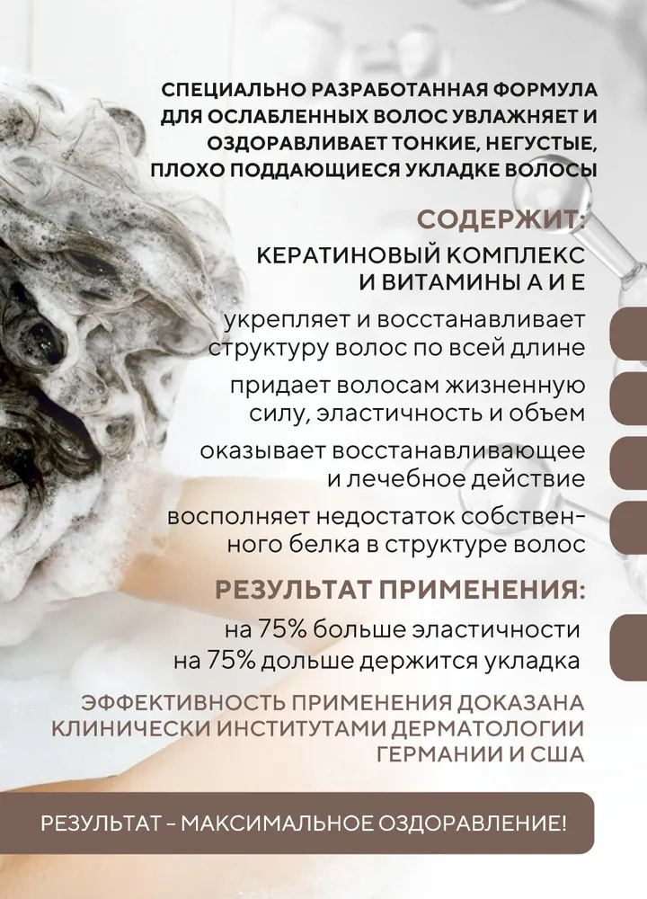 Специально разработанная формула для тонких и ослабленных волос, укрепляет и восстанавливает структуру волос по всей длине. Волосы обретают жизненную силу, эластичность и объем.