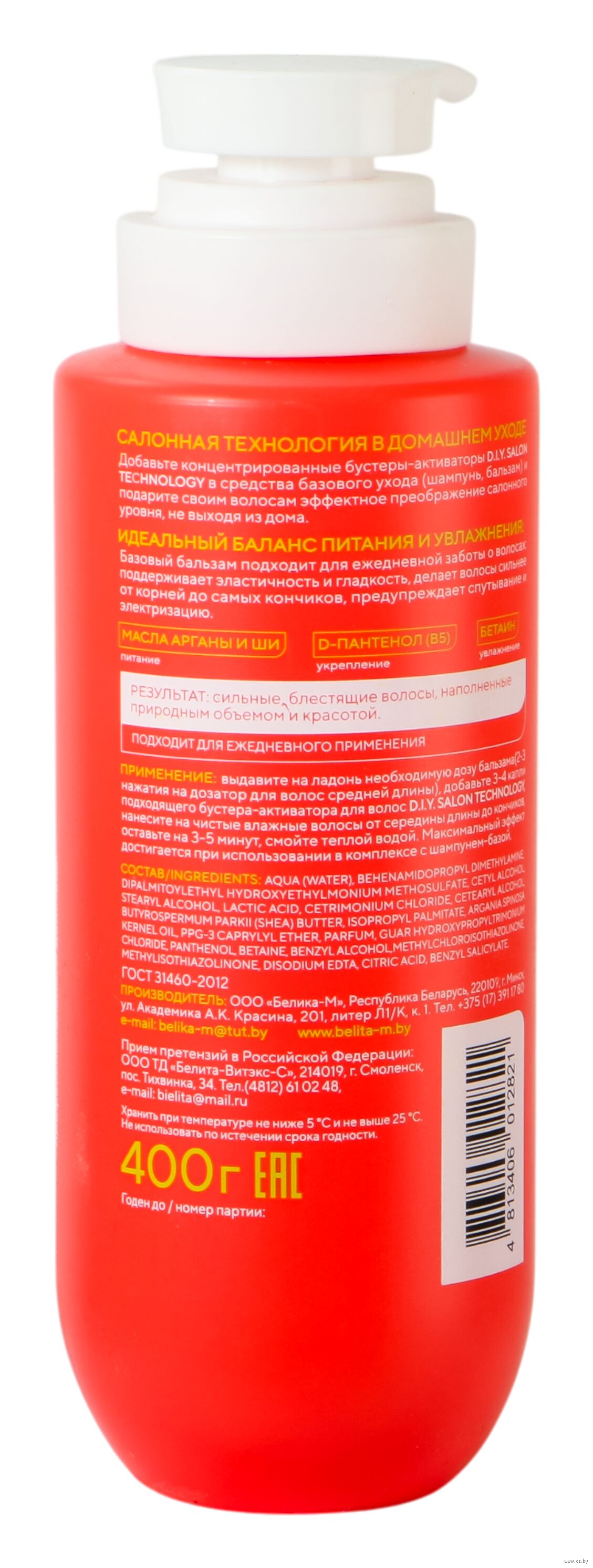 Выдавите на ладонь необходимую дозу бальзама (2-3 нажатия на дозатор для волос средней длины), добавьте 3-4 капли подходящего бустера-активатора для воло, нанесите на чистые влажные волосы от середины длины до кончиков, оставьте на 3-5 минут, смойте теплой водой.Состав