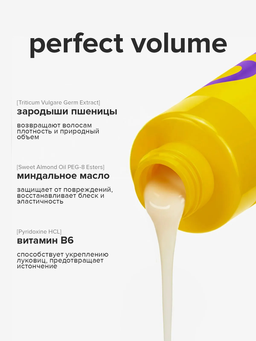 Благодаря профессиональной формуле с экстрактами овса, гречихи и зародышей пшеницы кондиционер "Perfect Volume" интенсивно увлажняет и насыщает волосы микроэлементами и витаминами, тем самым повышая эластичность локонов.
