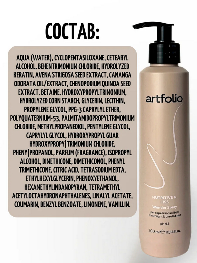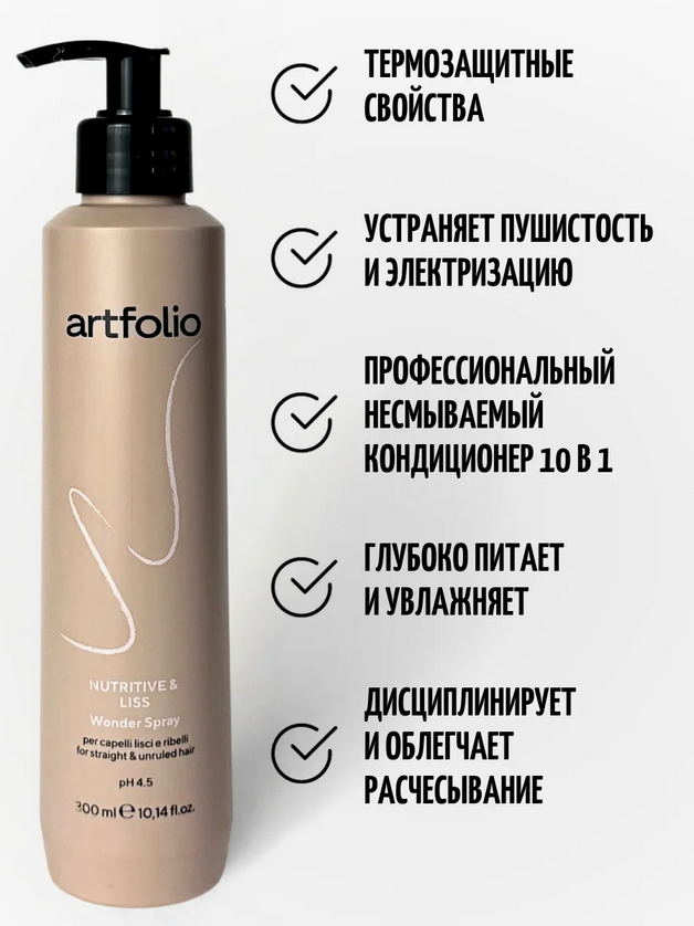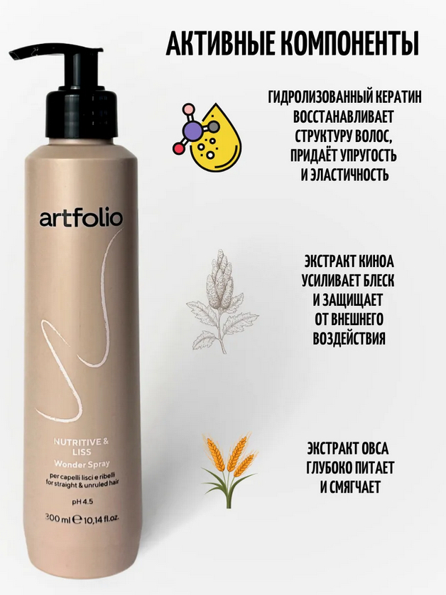 Питательный и разглаживающий несмываемый кондиционер 10 в 1. Усиленный блеск, термозащита, запечатывает кончики, убирает пушистость, увлажняет и уплотняет волос, делая его эластичным. Предотвращает повреждение волос во время укладки. Активные ингредиенты: Гидролиpованный кератин, овес и киноа.