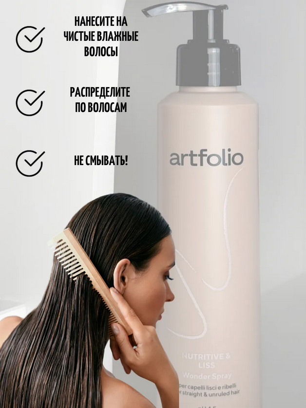 Нанести на длину и кончики влажных волос, расчесать и продолжить сушку по желаемому методу. Не смывать.Состав