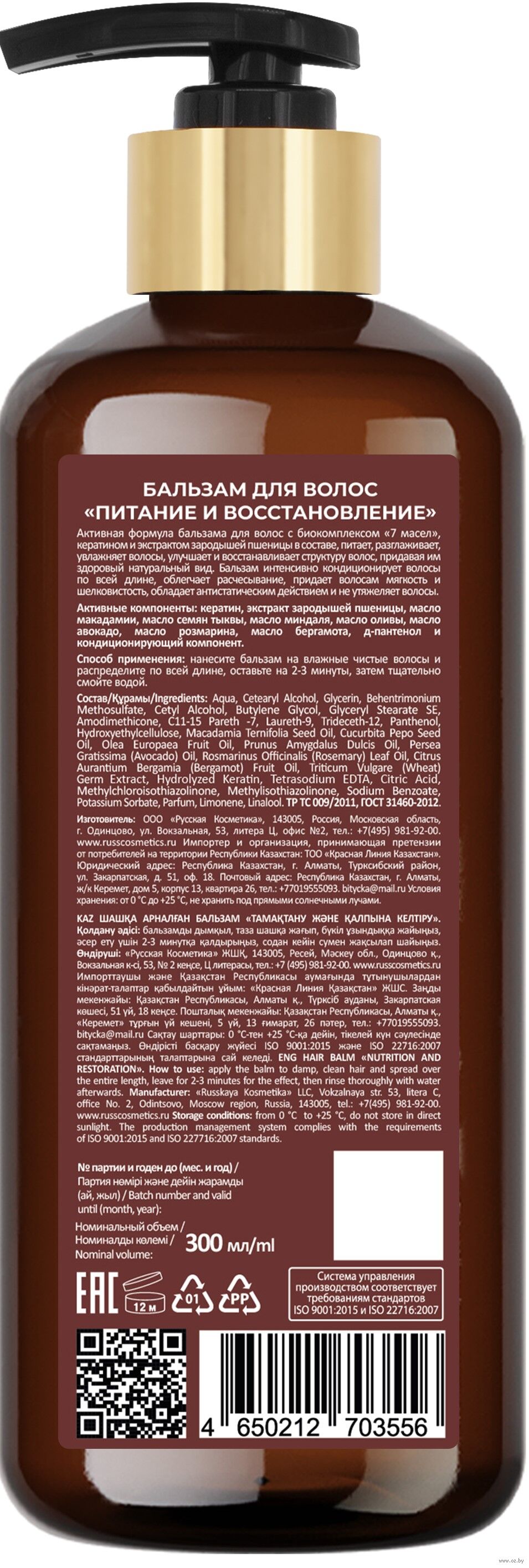 Активная формула бальзама для волос с биокомплексом «7 масел», кератином и экстрактом зародышей пшеницы в составе, питает, разглаживает, увлажняет волосы, улучшает и восстанавливает структуру волос, придавая им здоровый натуральный вид. Бальзам интенсивно кондиционирует волосы по всей длине, облегчает расчесывание, придает волосам мягкость и шелковистость, обладает антистатическим действием и не утяжеляет волосы.