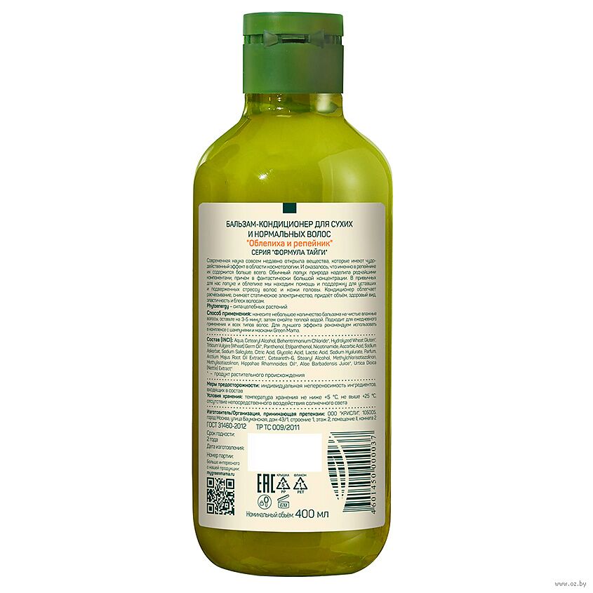 Кондиционер облегчает расчесывание, снимает статическое электричество, придает объем, здоровый вид, эластичность и блеск волосам. Натуральность состава подтверждена экологическим сертификатом соответствия.