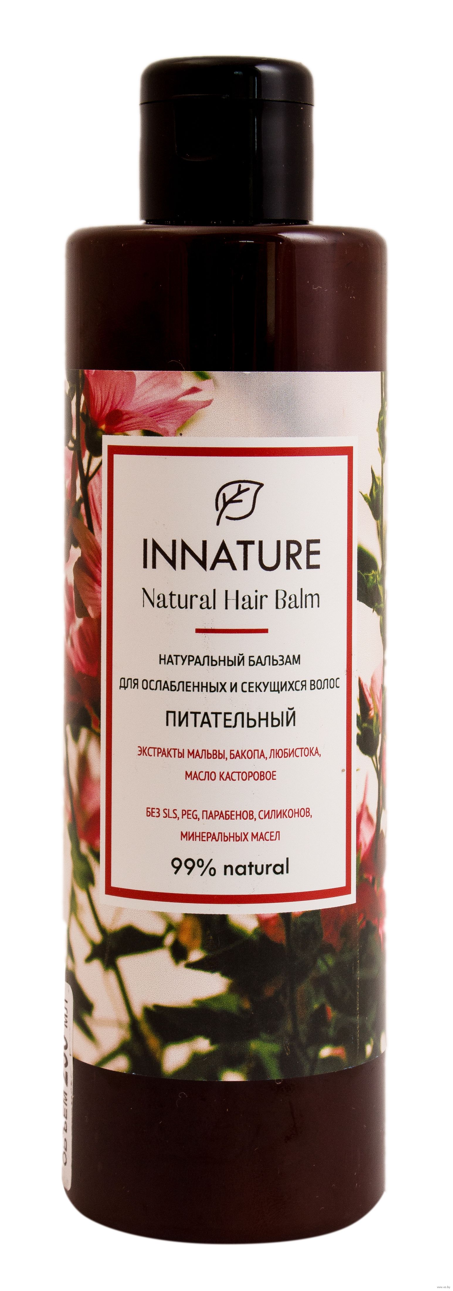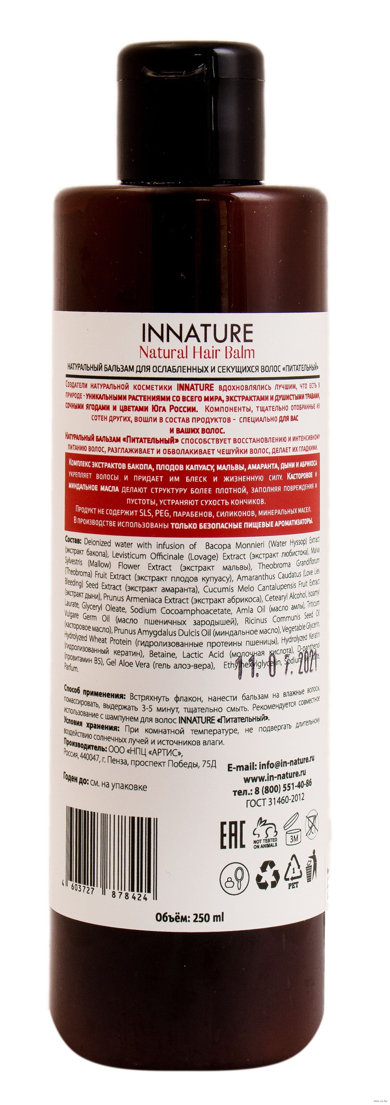 Встряхнуть флакон, нанести бальзам на влажные волосы, помассировать, выдержать 3-5 минут, тщательно смыть. Рекомендуется совместное использование с шампунем для волос "INNATURE. Питательный".Состав