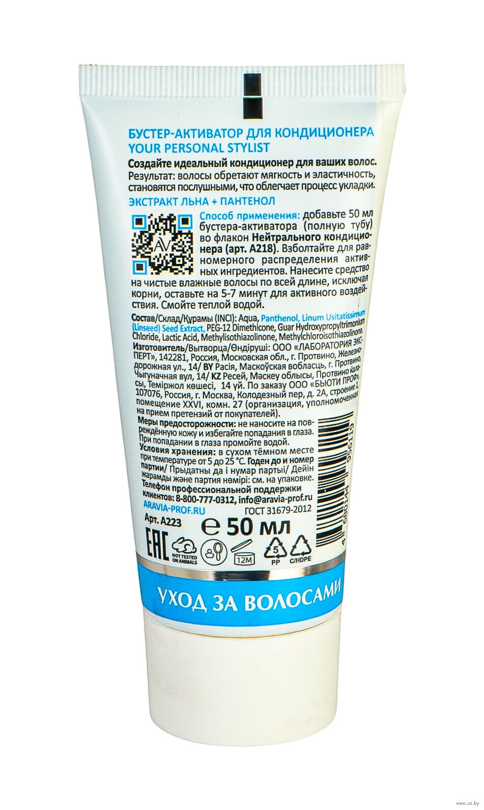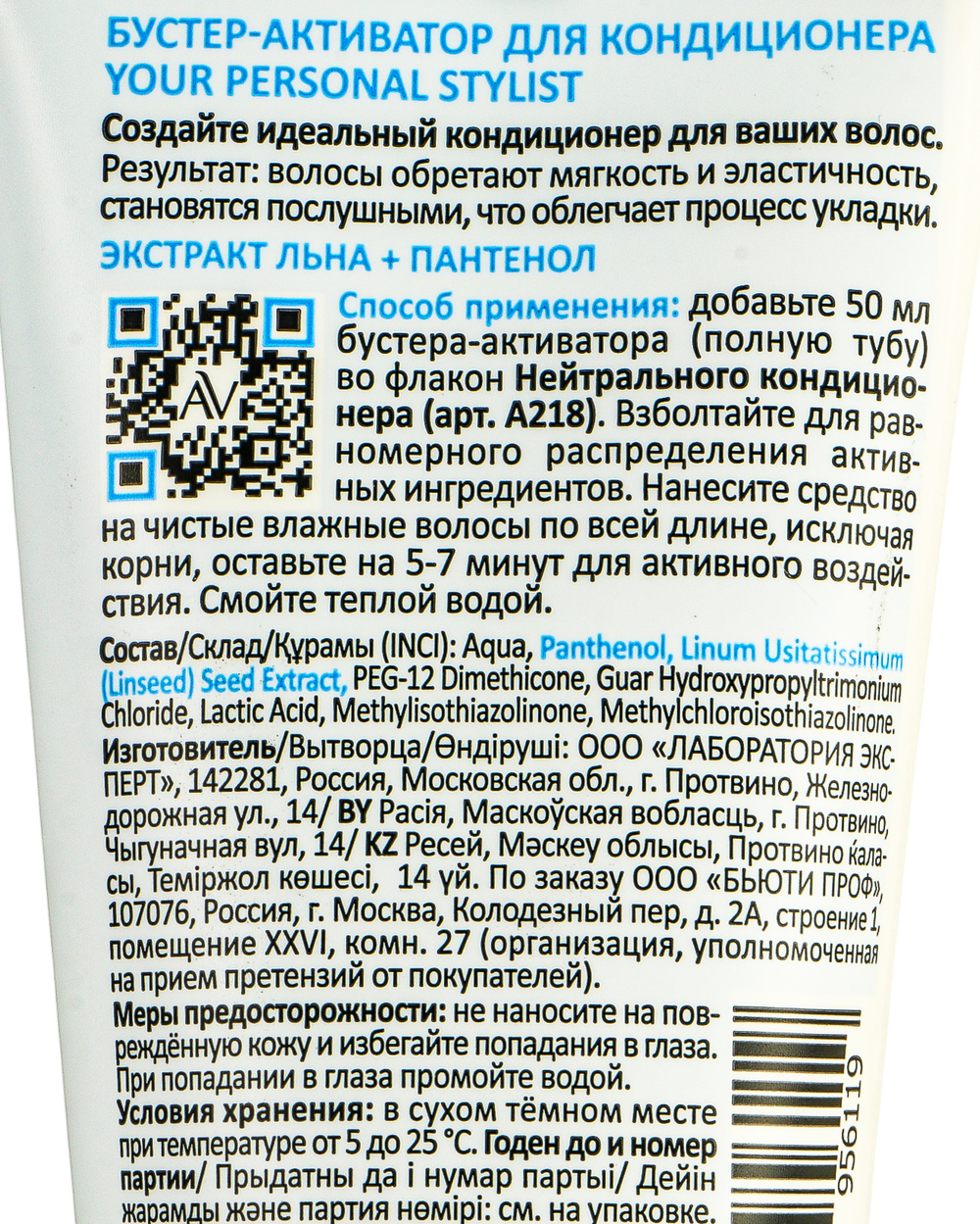 Добавьте 50 мл бустера-активатора (полную тубу) во флакон Нейтрального кондиционера (арт. А218). Взболтайте для равномерного распределения активных ингредиентов. Нанесите средство на чистые влажные волосы по всей длине, исключая корни, оставьте на 5-7 минут для активного воздействия. Смойте теплой водой.Состав
