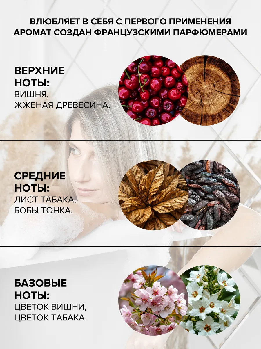 Закрывает волосяную кутикулу, тем самым уплотняет волос, предотвращает ломкость и пушистость, увлажняет, кондиционирует, придает блеск, упругость, объем, шелковистую мягкость, обволакивает защитной пленкой, окутывает локоны легким цветочным ароматом с нотами вишни и цветов табака.