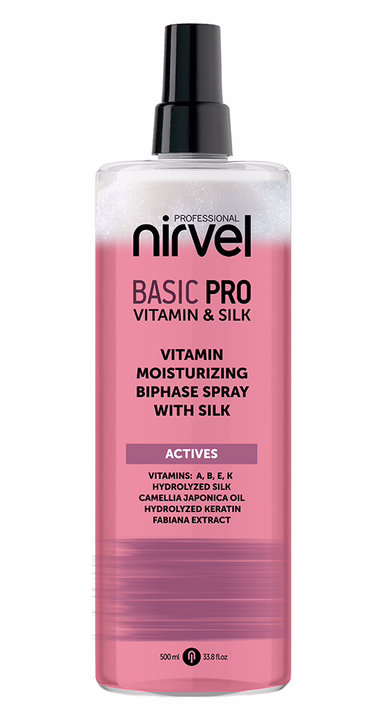 Витаминный увлажняющий двухфазный спрей-кондиционер с шелком Nirvel BasicPro Vitamin Biphase. Витаминный коктейль, входящий в состав камелии японской и экстрактов тысячелистника и фабианы активно увлажняет, облегчает расчесывание, снимает статику, придавая волосам эластичность, мягкость и шелковистость.