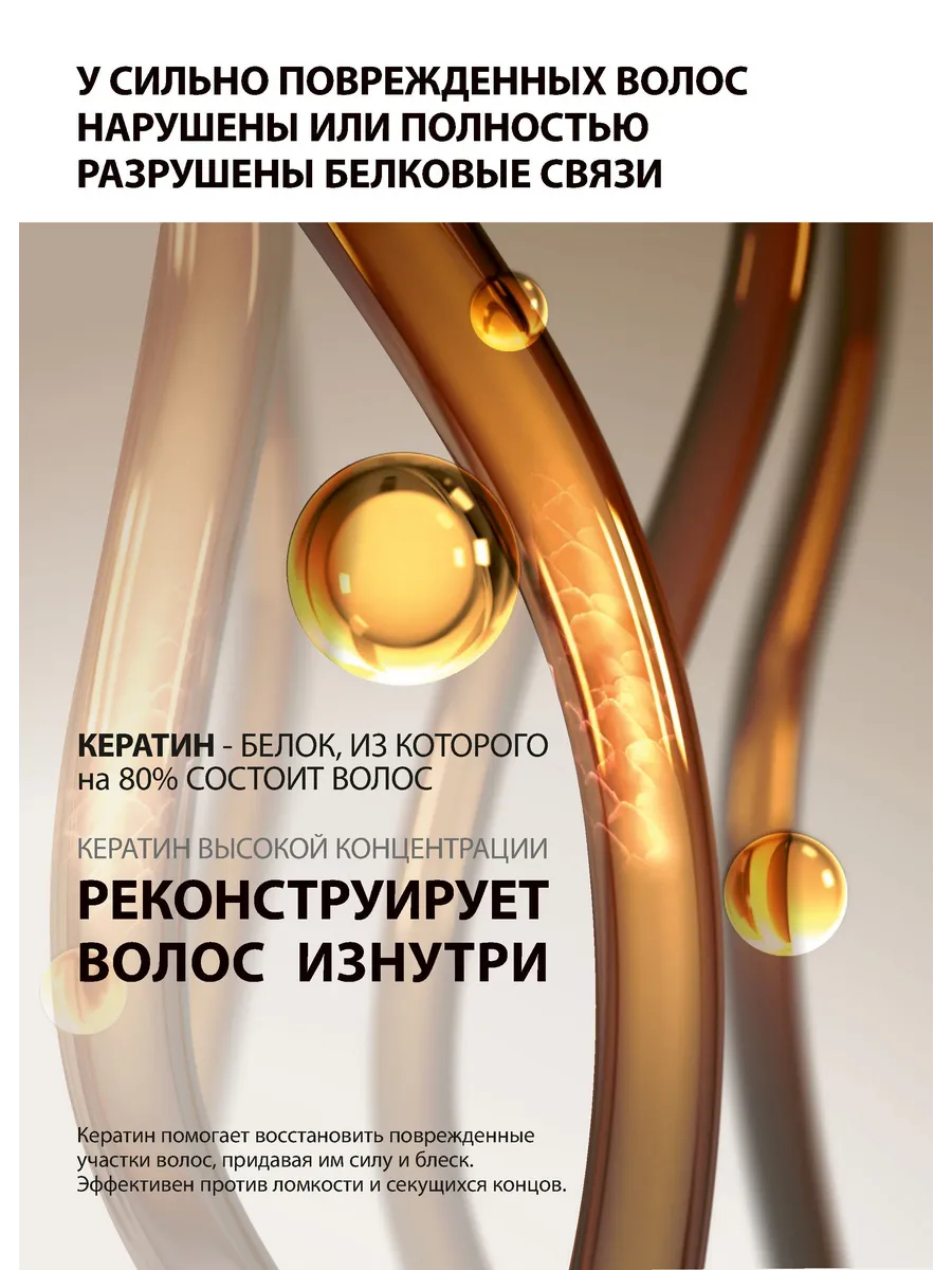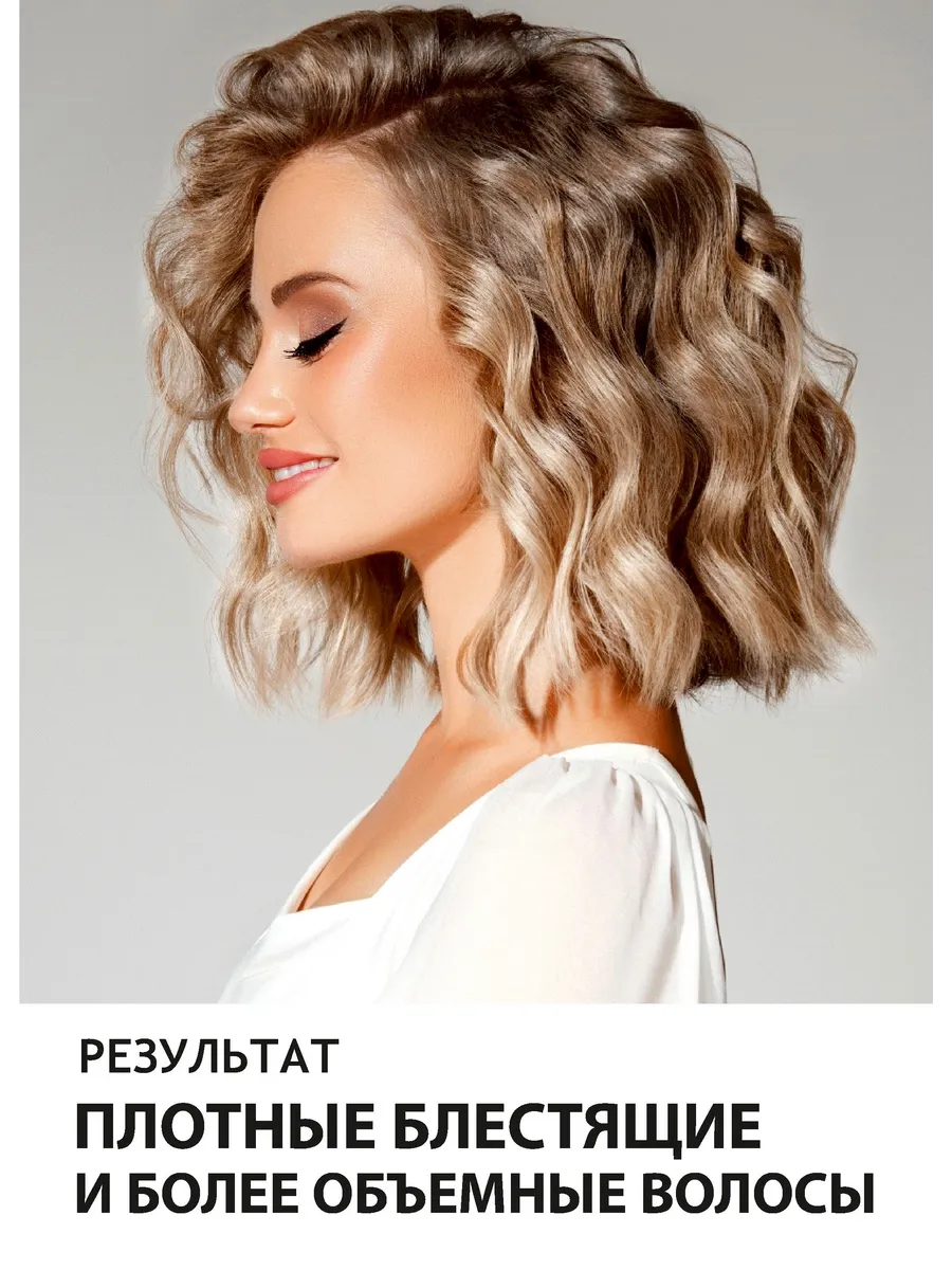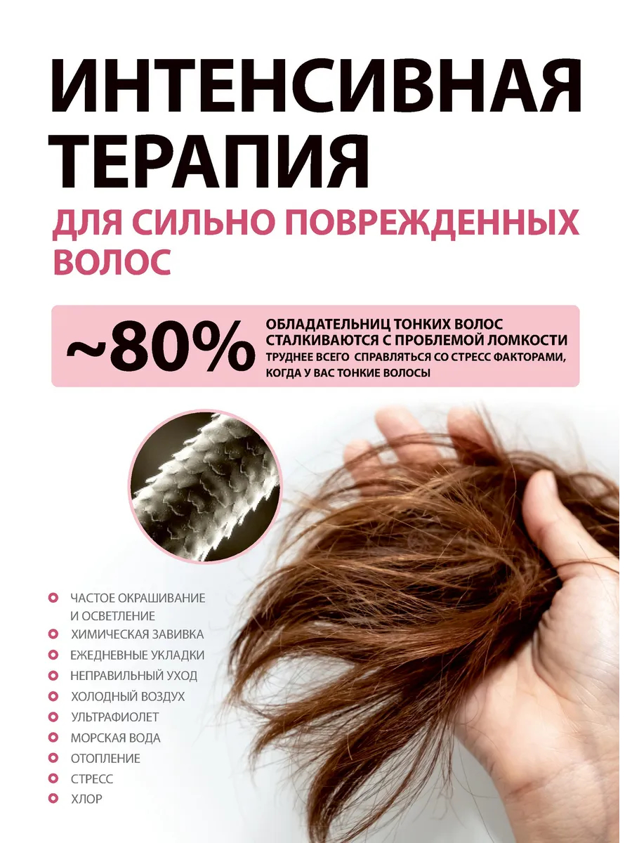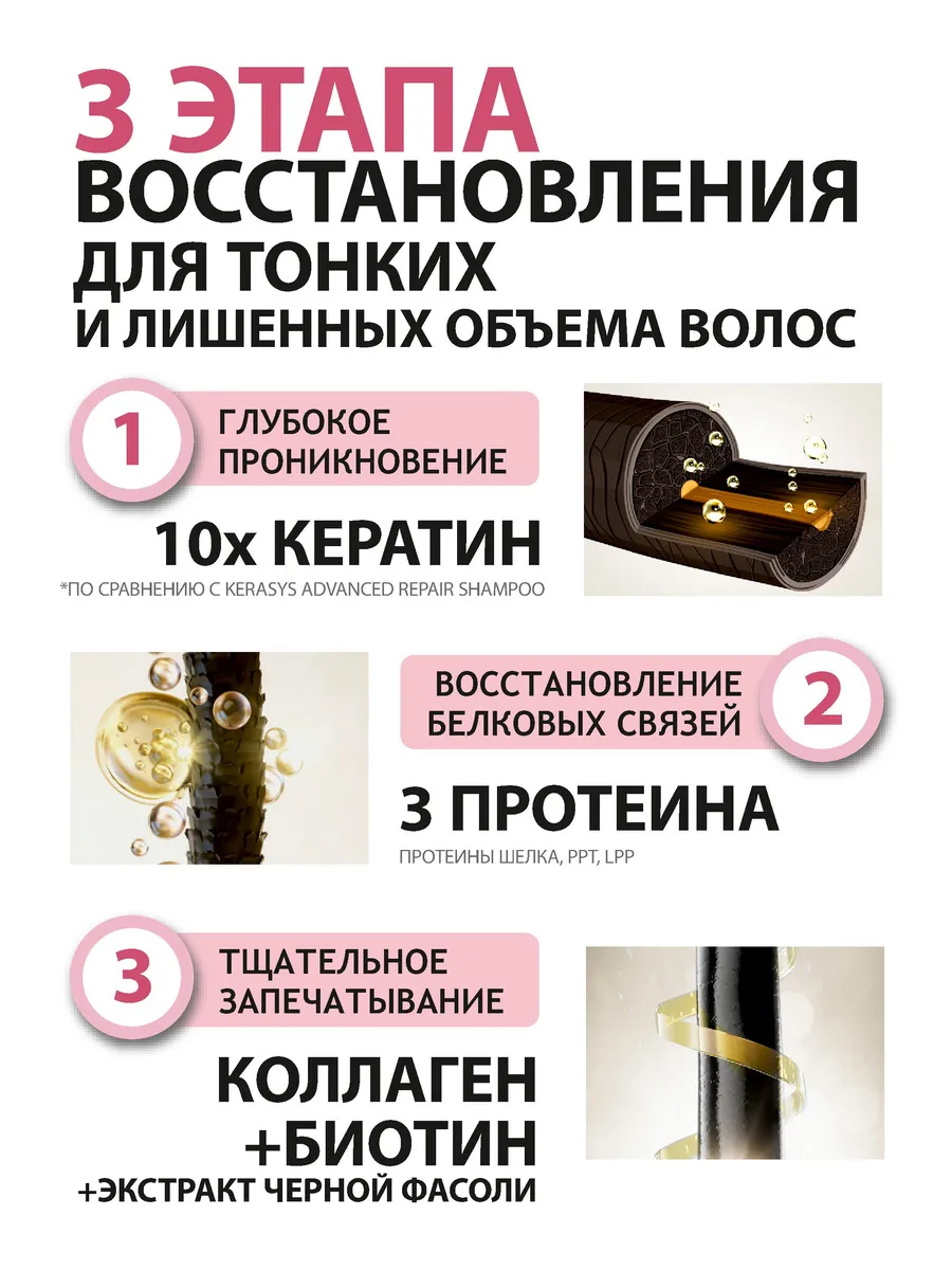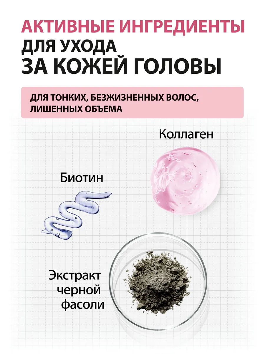 Специально разработанная формула для восстановления эластичности и объема поврежденных, ослабленных, тонких волос без объема с коллагеном, биотином (витамин В7), экстрактом черной фасоли.