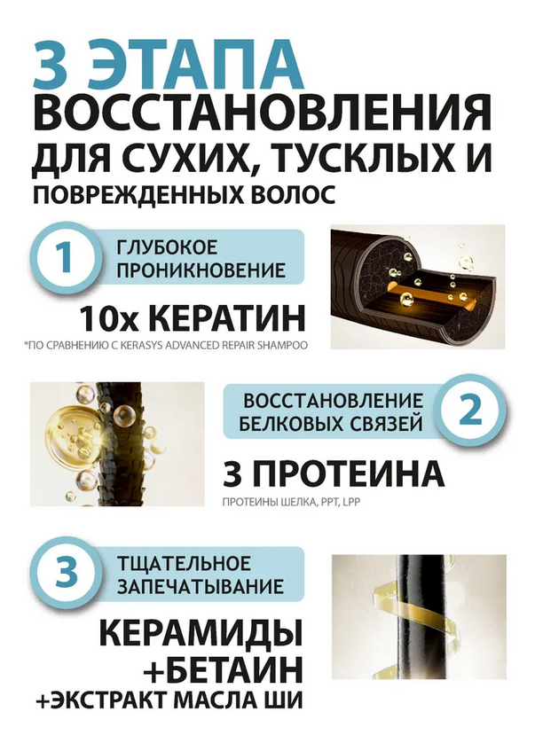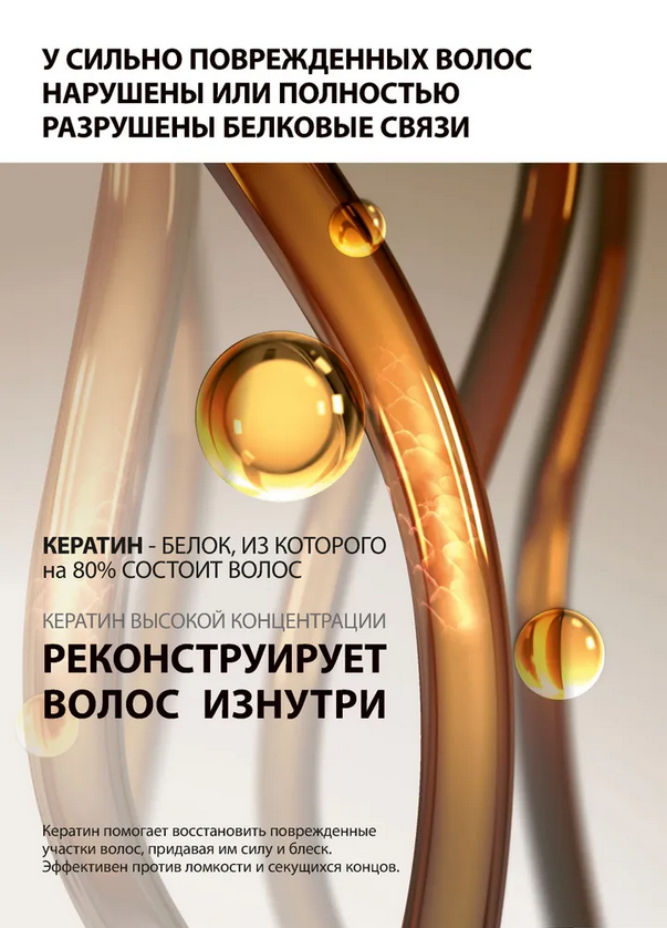 Шаг 1. Ампула с кератином. Содержит в 10 раз больше кератина. Кератин проникает в глубокие слои волоса, заполняет пустоты, улучшая его структуру изнутри.